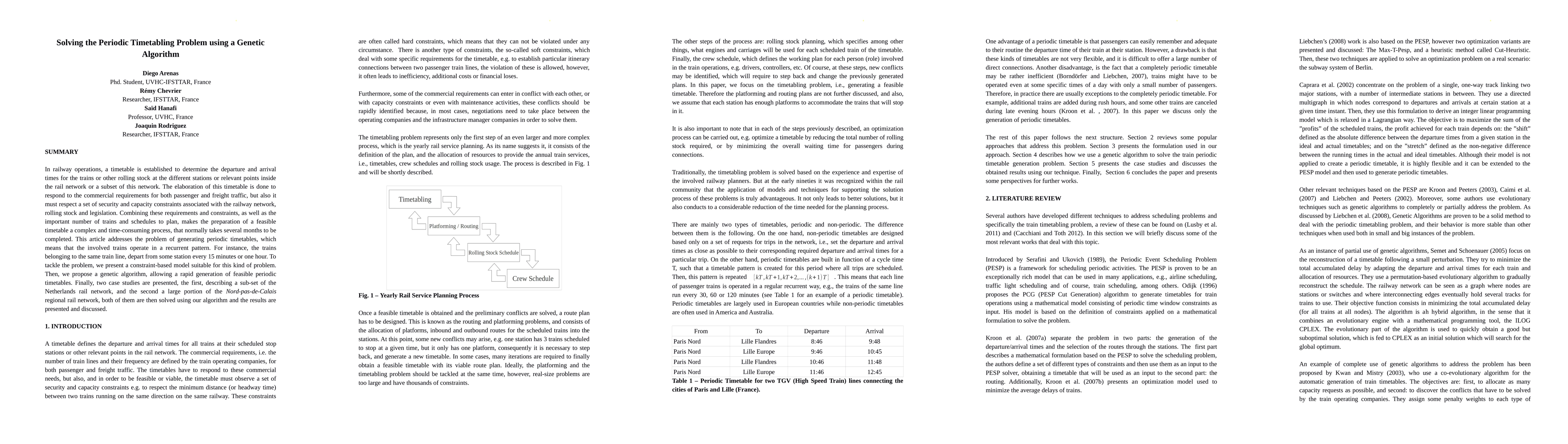 In railway operations, a timetable is established to determine the departure and arrival times for the trains or other rolling stock at the different stations or relevant points inside the rail network or a subset of this network. The elaboration of this timetable is done to respond to the commercial requirements for both passenger and freight traffic, but also it must respect a set of security and capacity constraints associated with the railway network, rolling stock and legislation. Combining these requirements and constraints, as well as the important number of trains and schedules to plan, makes the preparation of a feasible timetable a complex and time-consuming process, that normally takes several months to be completed. This article addresses the problem of generating periodic timetables, which means that the involved trains operate in a recurrent pattern. For instance, the trains belonging to the same train line, depart from some station every 15 minutes or one hour. To tackle the problem, we present a constraint-based model suitable for this kind of problem. Then, we propose a genetic algorithm, allowing a rapid generation of feasible periodic timetables. Finally, two case studies are presented, the first, describing a sub-set of the Netherlands rail network, and the second a large portion of the Nord-pas-de-Calais regional rail network, both of them are then solved using our algorithm and the results are presented and discussed.