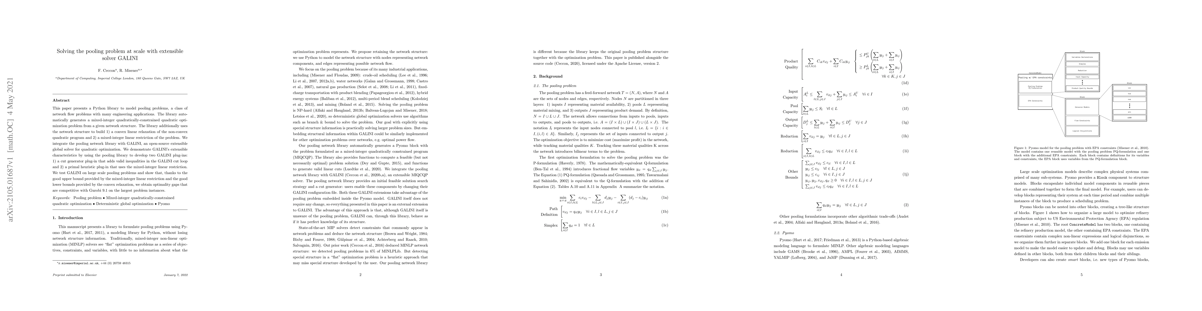 This paper presents a Python library to model pooling problems, a class of network flow problems with many engineering applications. The library automatically generates a mixed-integer quadratically-constrained quadratic optimization problem from a given network structure. The library additionally uses the network structure to build 1) a convex linear relaxation of the non-convex quadratic program and 2) a mixed-integer linear restriction of the problem. We integrate the pooling network library with galini, an open-source extensible global solver for quadratic optimization. We demonstrate galini's extensible characteristics by using the pooling library to develop two galini plug-ins: 1) a cut generator plug-in that adds valid inequalities in the galini cut loop and 2) a primal heuristic plug-in that uses the mixed-integer linear restriction. We test galini on large scale pooling problems and show that, thanks to the good upper bound provided by the mixed-integer linear restriction and the good lower bounds provided by the convex relaxation, we obtain optimality gaps that are competitive with Gurobi 9.1 on the largest problem instances.