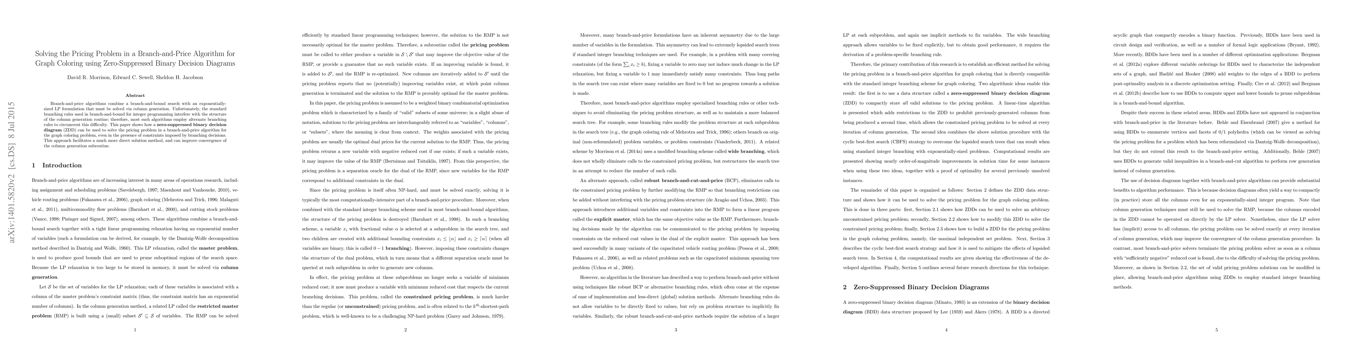 This paper proposes using zero-suppressed binary decision diagrams (ZDD) to solve the pricing problem in branch-and-price algorithms for graph coloring, offering a more direct solution method and potentially improving convergence of the column generation subroutine, despite constraints from branching decisions.