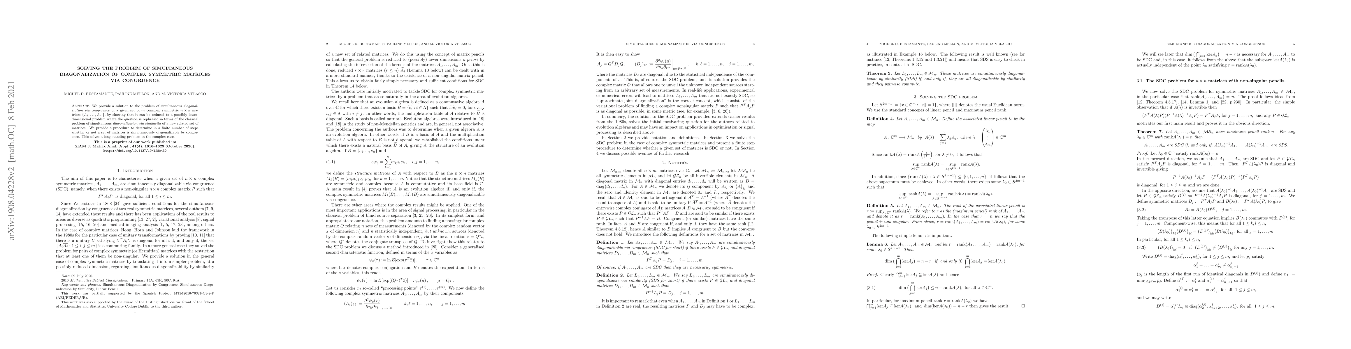 This paper presents a method to solve the problem of simultaneously diagonalizing a set of complex symmetric matrices via congruence, reducing it to a lower-dimensional problem of simultaneous diagonalization via similarity. It provides a finite-step procedure to determine the simultaneous diagonalizability by congruence, resolving a longstanding issue in complex matrix theory.