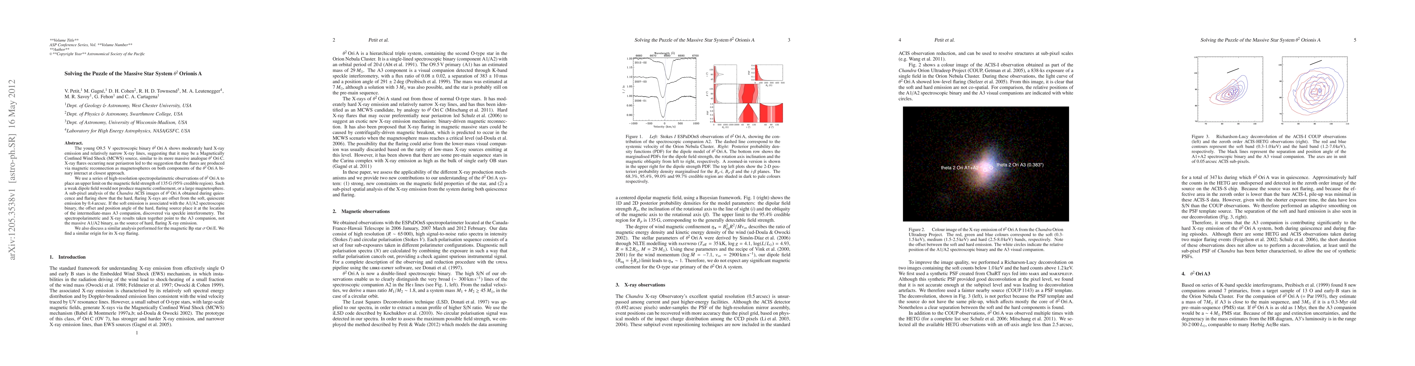 The young O9.5 V spectroscopic binary Theta 2 Ori A shows moderately hard X-ray emission and relatively narrow X-ray lines, suggesting that it may be a Magnetically Confined Wind Shock (MCWS) source, similar to its more massive analogue Theta 1 Ori C. X-ray flares occurring near periastron led to the suggestion that the flares are produced via magnetic reconnection as magnetospheres on both components of the Theta 2 Ori A binary interact at closest approach. We use a series of high-resolution spectropolarimetric observations of Theta 2 Ori A to place an upper limit on the magnetic field strength of 135 G (95% credible region). Such a weak dipole field would not produce magnetic confinement, or a large magnetosphere. A sub-pixel analysis of the Chandra ACIS images of Theta 2 Ori A obtained during quiescence and flaring show that the hard, flaring X-rays are offset from the soft, quiescent emission by 0.4 arcsec. If the soft emission is associated with the A1/A2 spectroscopic binary, the offset and position angle of the hard, flaring source place it at the location of the intermediate-mass A3 companion, discovered via speckle interferometry. The spectropolarimetric and X-ray results taken together point to the A3 companion, not the massive A1/A2 binary, as the source of hard, flaring X-ray emission. We also discuss a similar analysis performed for the magnetic Bp star Sigma Ori E. We find a similar origin for its X-ray flaring.