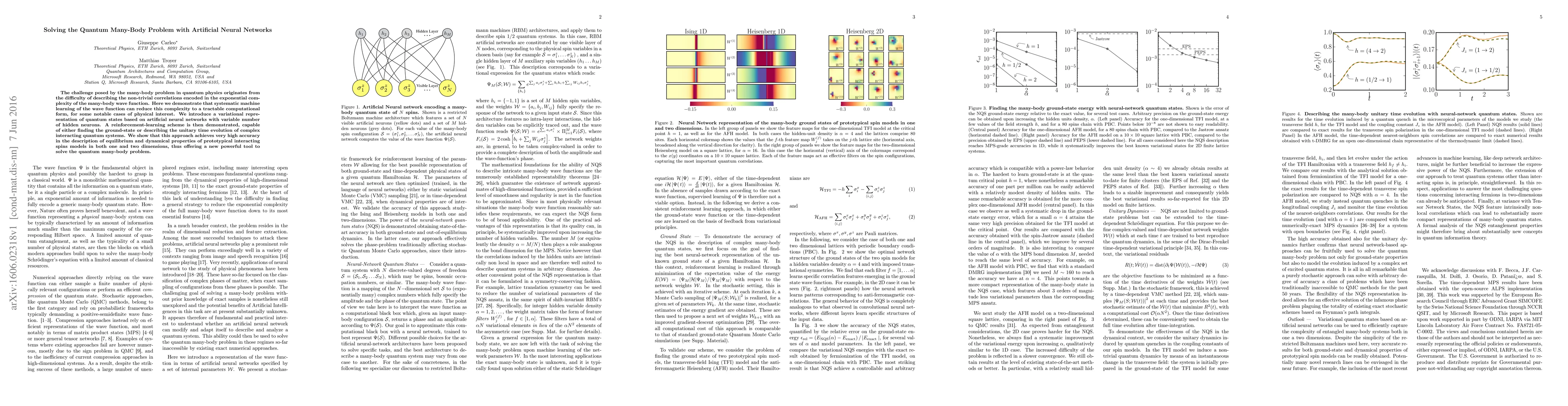 This paper proposes using artificial neural networks to tackle the quantum many-body problem by learning the wave function, demonstrating high accuracy in describing equilibrium and dynamical properties of interacting spin models. The approach employs a variational representation and reinforcement learning to achieve this, offering a new method for solving complex quantum systems.