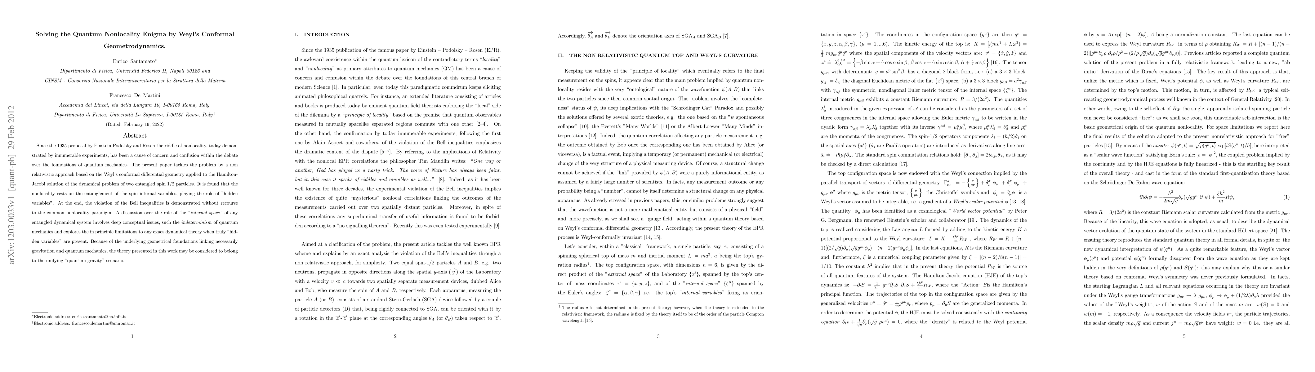This paper proposes a non-relativistic solution to quantum nonlocality using Weyl's conformal differential geometry, demonstrating that entanglement of spin internal variables acts as "hidden variables" and leads to Bell inequality violations without traditional nonlocality. The study explores deep conceptual issues regarding the "internal space" of entangled systems and the indeterminism of quantum mechanics, suggesting a potential link to quantum gravity.