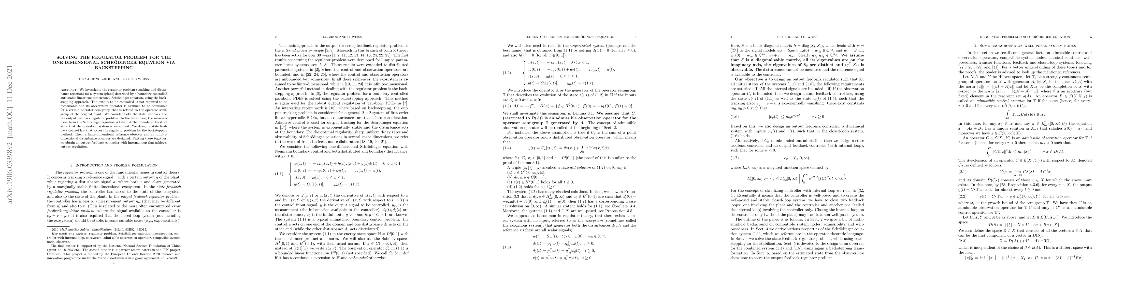 We investigate the regulator problem (tracking and disturbance rejection) for a system (plant) described by a boundary controlled anti-stable linear one-dimensional Schrodinger equation, using the backstepping approach. The output to be controlled is not required to be measurable and its observation operator is assumed to be admissible for a certain operator semigroup that is related to the operator semigroup of the original plant. We consider both the state feedback and the output feedback regulator problem. In the latter case, the measurement from the Schrodinger equation is taken at the boundary. First we show that the open-loop system is well-posed. We design a state feedback control law that solves the regulator problem by the backstepping method. Then, a finite-dimensional reference observer and an infinite-dimensional disturbance observer are designed. Putting these together, we obtain an output feedback controller with internal loop that achieves output regulation.
