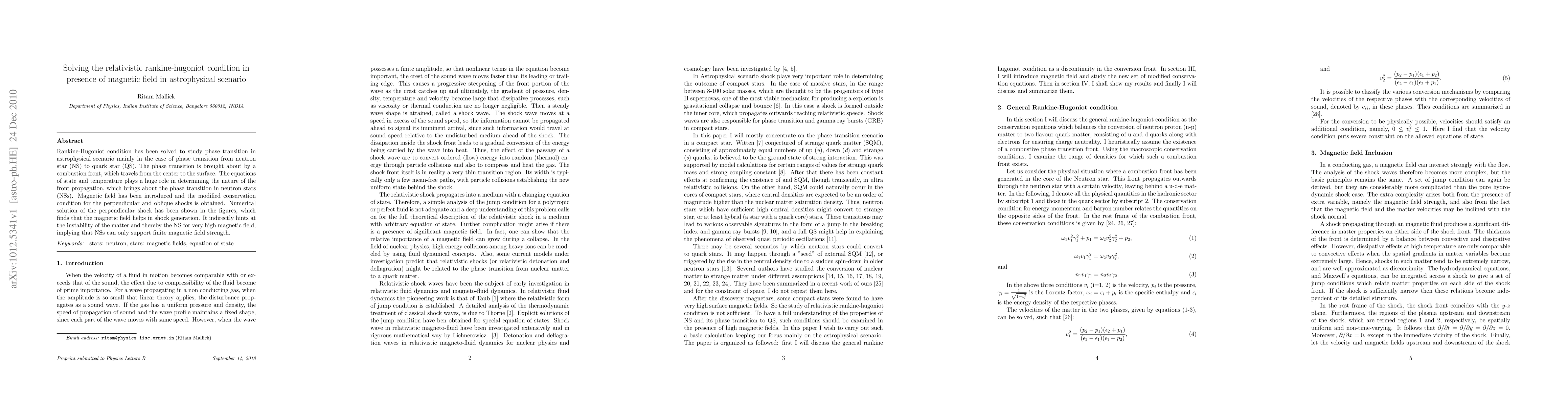 Rankine-Hugoniot condition has been solved to study phase transition in astrophysical scenario mainly in the case of phase transition from neutron star (NS) to quark star (QS). The phase transition is brought about by a combustion front, which travels from the center to the surface. The equations of state and temperature plays a huge role in determining the nature of the front propagation, which brings about the phase transition in neutron stars (NSs). Magnetic field has been introduced and the modified conservation condition for the perpendicular and oblique shocks is obtained. Numerical solution of the perpendicular shock has been shown in the figures, which finds that the magnetic field helps in shock generation. It indirectly hints at the instability of the matter and thereby the NS for very high magnetic field, implying that NSs can only support finite magnetic field strength.