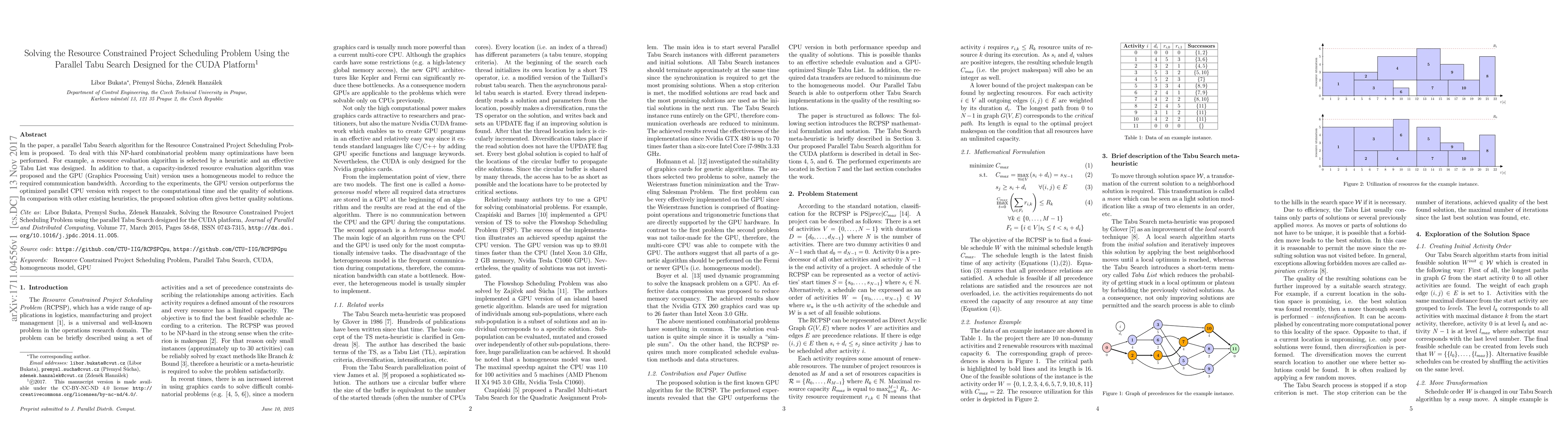 This paper proposes a parallel Tabu Search algorithm for solving the Resource Constrained Project Scheduling Problem, optimized for GPU execution using CUDA. The GPU version significantly outperforms the parallel CPU version in computational time and solution quality, often providing better results compared to existing heuristics.