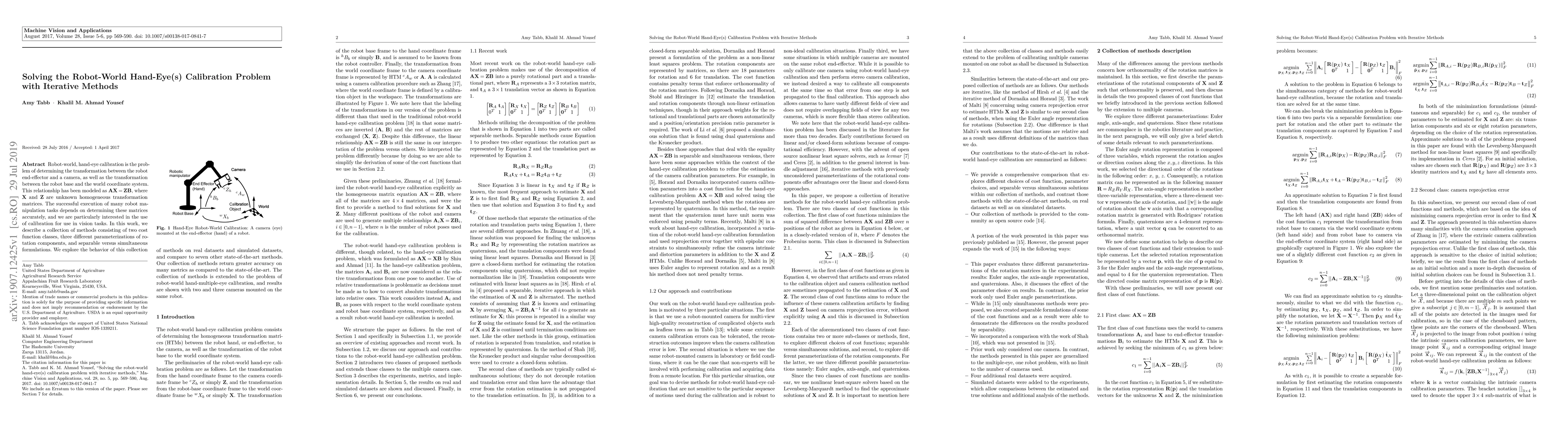 This paper presents iterative methods for calibrating the relationship between a robot's end-effector and camera, as well as the robot base and world coordinate system. The proposed collection of methods, including various cost functions and parameterizations, outperforms seven state-of-the-art techniques in accuracy, and is extended to handle multiple cameras on a single robot.
