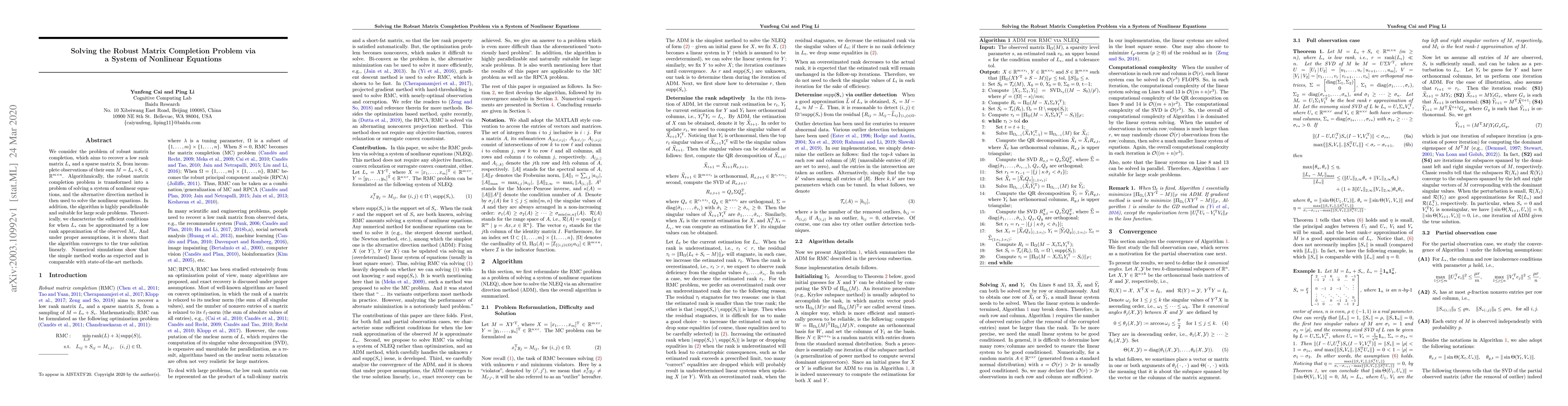 This paper proposes a method to solve the robust matrix completion problem by transforming it into a system of nonlinear equations, which is then solved using the alternative direction method. The algorithm is parallelizable and converges linearly under proper assumptions, with numerical simulations showing its effectiveness.