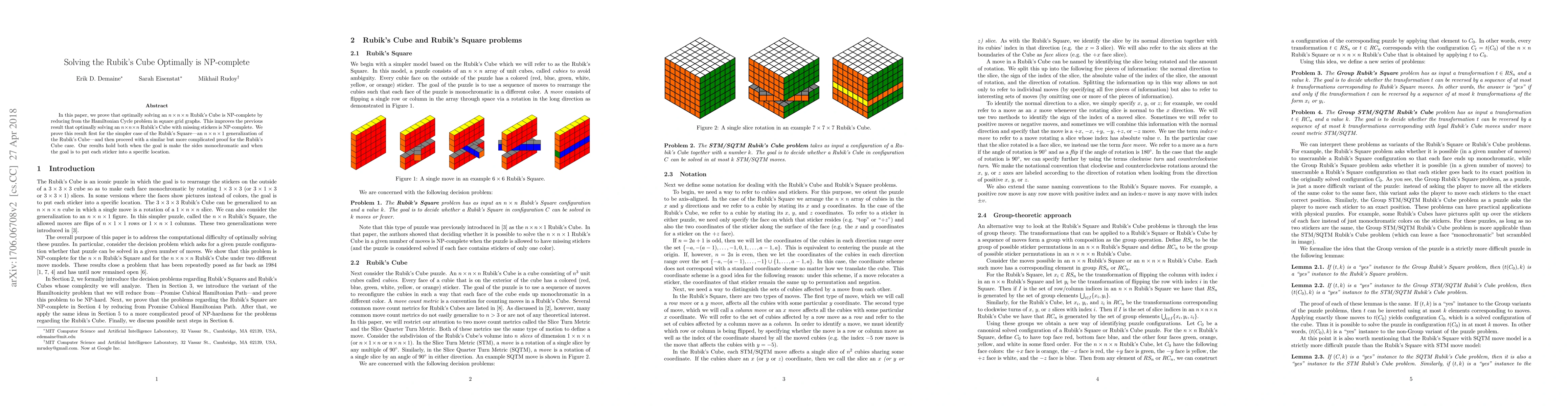 This paper demonstrates that optimally solving an $n \times n \times n$ Rubik's Cube is NP-complete by reducing the Hamiltonian Cycle problem from square grid graphs. It builds on previous results by proving the complexity for the Rubik's Cube without missing stickers.