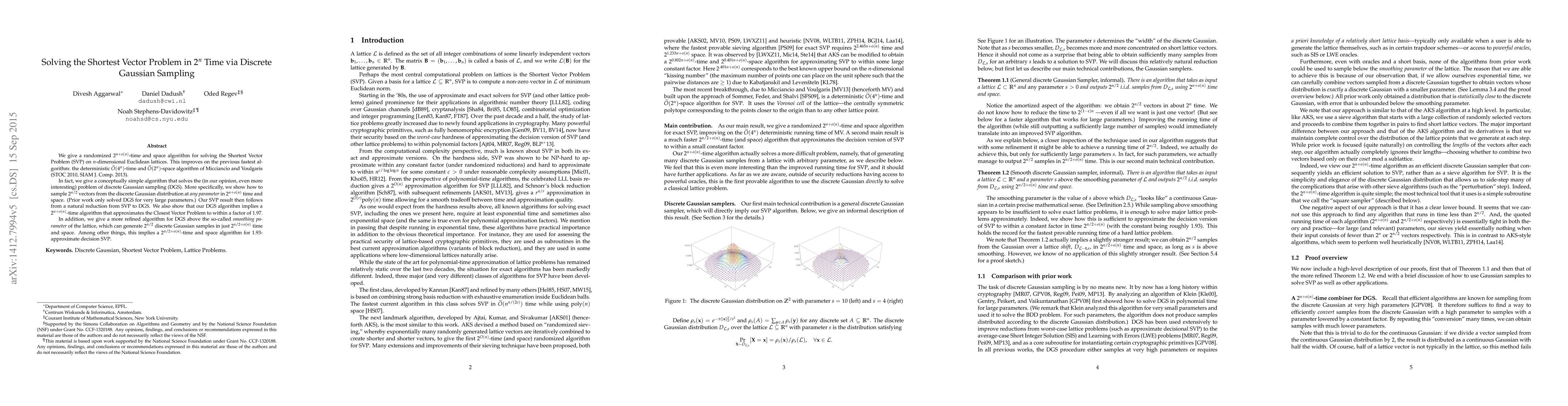 Researchers developed an algorithm to solve the Shortest Vector Problem in $2^n$ time, improving previous fastest algorithms, and also showed how to sample vectors from a discrete Gaussian distribution at any parameter in $2^{n+o(n)}$ time and space.