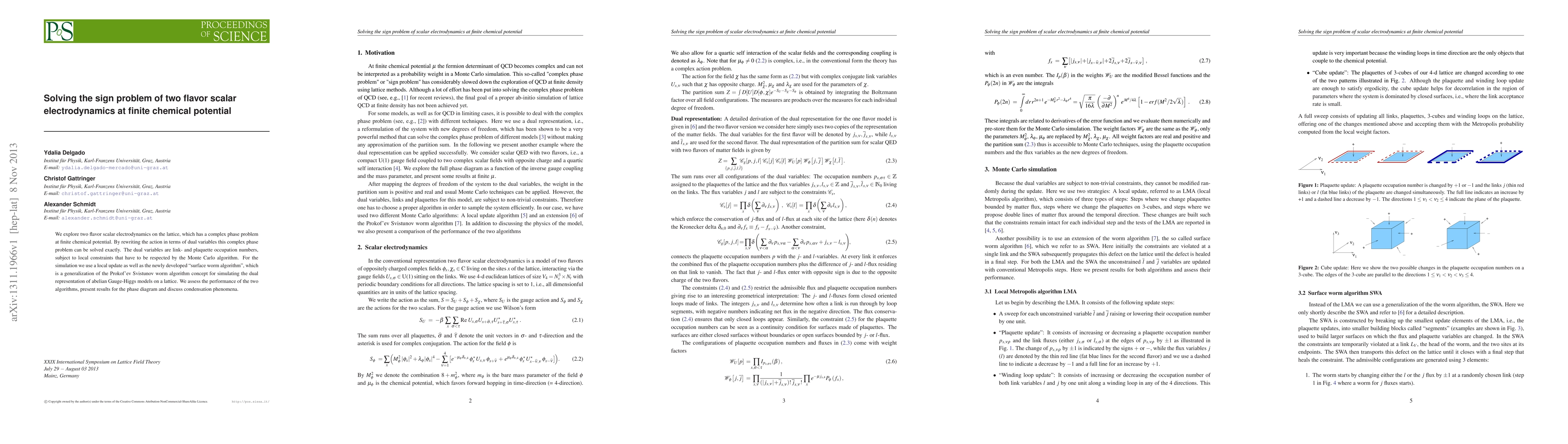 This research introduces a method to solve the sign problem in two-flavor scalar electrodynamics at finite chemical potential by rewriting the action in terms of dual variables, which are link and plaquette occupation numbers. The study uses a local update and a new 'surface worm algorithm' for simulation, presenting results for the phase diagram and discussing condensation phenomena.