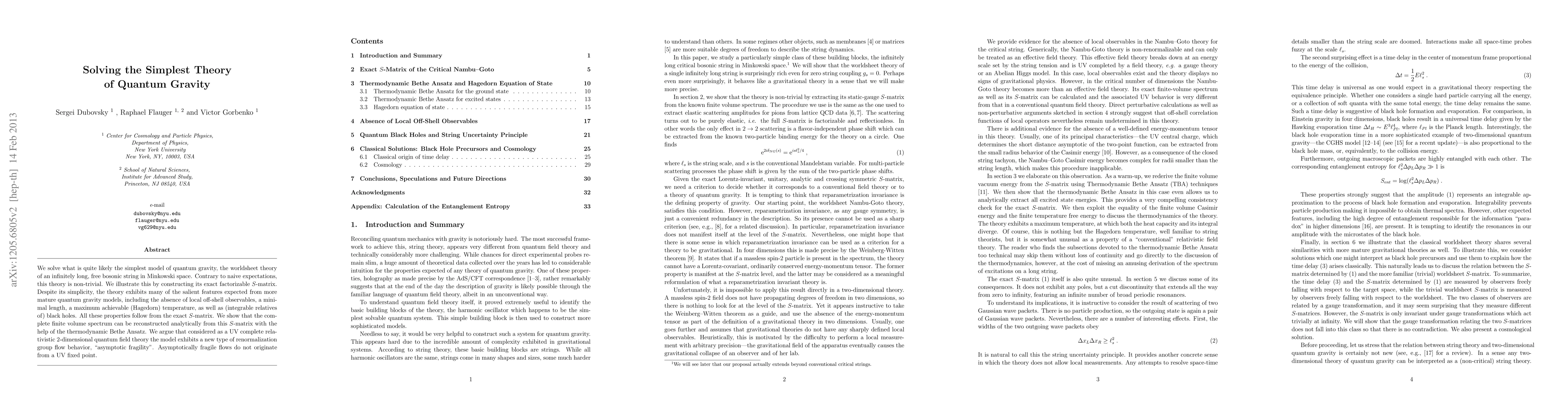 We solve what is quite likely the simplest model of quantum gravity, the worldsheet theory of an infinitely long, free bosonic string in Minkowski space. Contrary to naive expectations, this theory is non-trivial. We illustrate this by constructing its exact factorizable S-matrix. Despite its simplicity, the theory exhibits many of the salient features expected from more mature quantum gravity models, including the absence of local off-shell observables, a minimal length, a maximum achievable (Hagedorn) temperature, as well as (integrable relatives of) black holes. All these properties follow from the exact S-matrix. We show that the complete finite volume spectrum can be reconstructed analytically from this S-matrix with the help of the thermodynamic Bethe Ansatz. We argue that considered as a UV complete relativistic two-dimensional quantum field theory the model exhibits a new type of renormalization group flow behavior, "asymptotic fragility". Asymptotically fragile flows do not originate from a UV fixed point.