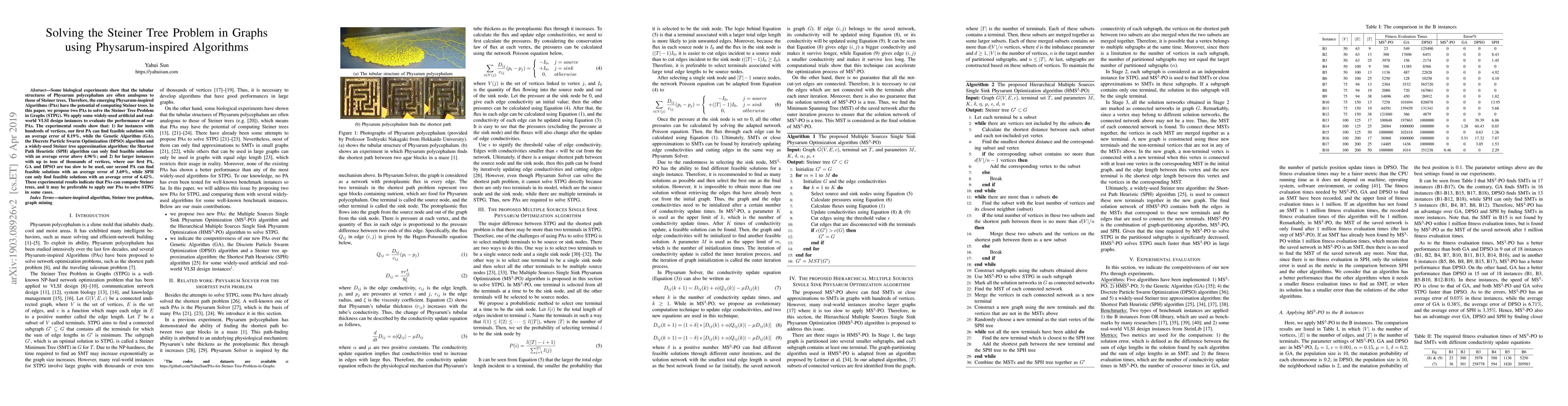 This paper proposes two Physarum-inspired Algorithms (PAs) to solve the Steiner Tree Problem in Graphs (STPG), demonstrating their effectiveness through comparisons with Genetic Algorithm (GA), Discrete Particle Swarm Optimization (DPSO), and Shortest Path Heuristic (SPH). The first PA achieves an average error of 0.19% for smaller instances, while the second PA performs well with larger instances, showing an average error of 3.69%.