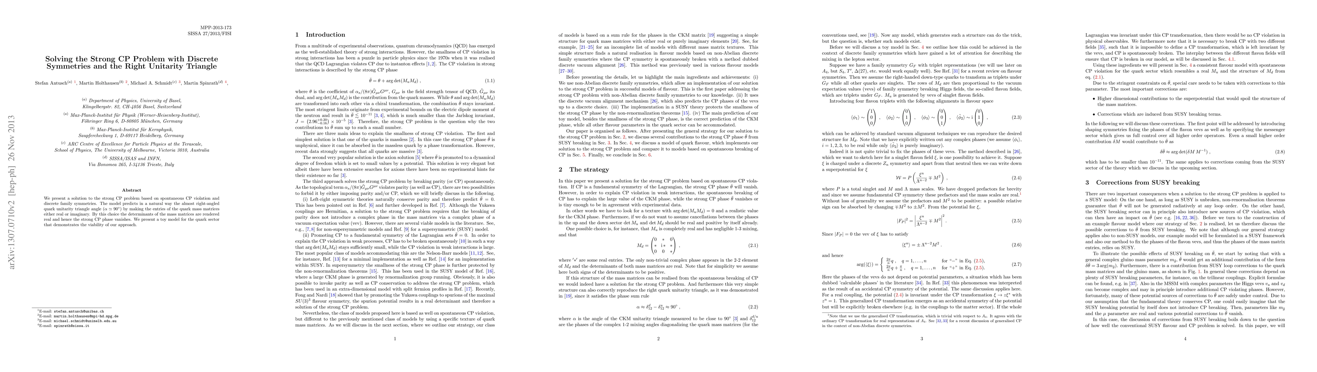 This paper proposes a solution to the strong CP problem using spontaneous CP violation and discrete family symmetries, predicting an almost right-angled quark unitarity triangle angle. The model achieves this by ensuring the quark mass matrices' entries are either real or imaginary, thus rendering the strong CP phase vanishing.