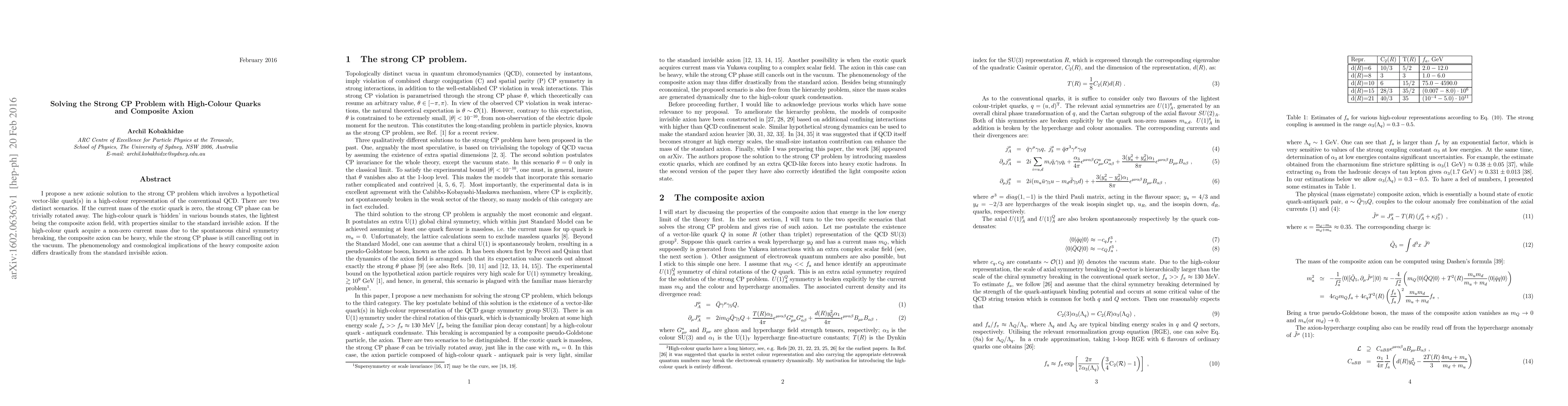 This paper proposes a novel axionic solution to the strong CP problem using high-colour quarks, suggesting that a composite axion can arise from their bound states. Depending on the quark's mass, the axion can either be light, similar to the standard invisible axion, or heavy, with distinct phenomenology and cosmological implications.
