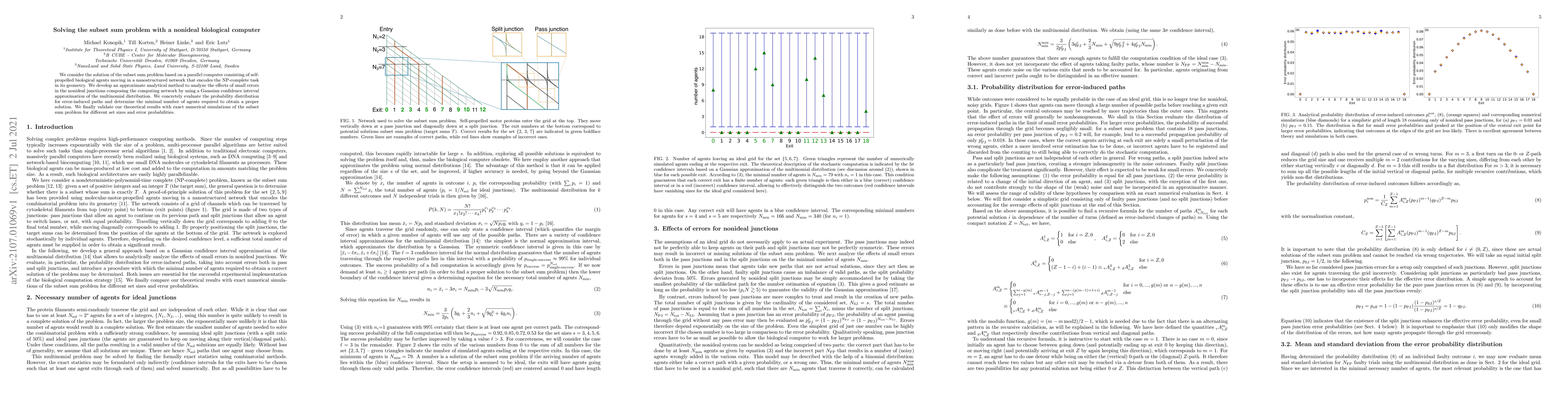 We consider the solution of the subset sum problem based on a parallel computer consisting of self-propelled biological agents moving in a nanostructured network that encodes the NP-complete task in its geometry. We develop an approximate analytical method to analyze the effects of small errors in the nonideal junctions composing the computing network by using a Gaussian confidence interval approximation of the multinomial distribution. We concretely evaluate the probability distribution for error-induced paths and determine the minimal number of agents required to obtain a proper solution. We finally validate our theoretical results with exact numerical simulations of the subset sum problem for different set sizes and error probabilities.