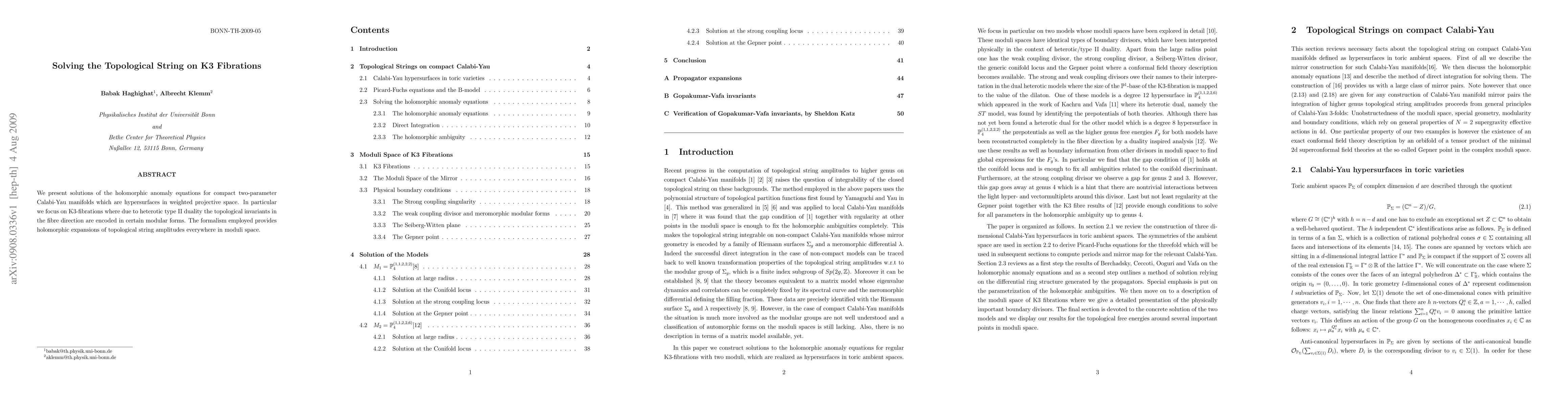 We present solutions of the holomorphic anomaly equations for compact two-parameter Calabi-Yau manifolds which are hypersurfaces in weighted projective space. In particular we focus on K3-fibrations where due to heterotic type II duality the topological invariants in the fibre direction are encoded in certain modular forms. The formalism employed provides holomorphic expansions of topological string amplitudes everywhere in moduli space.