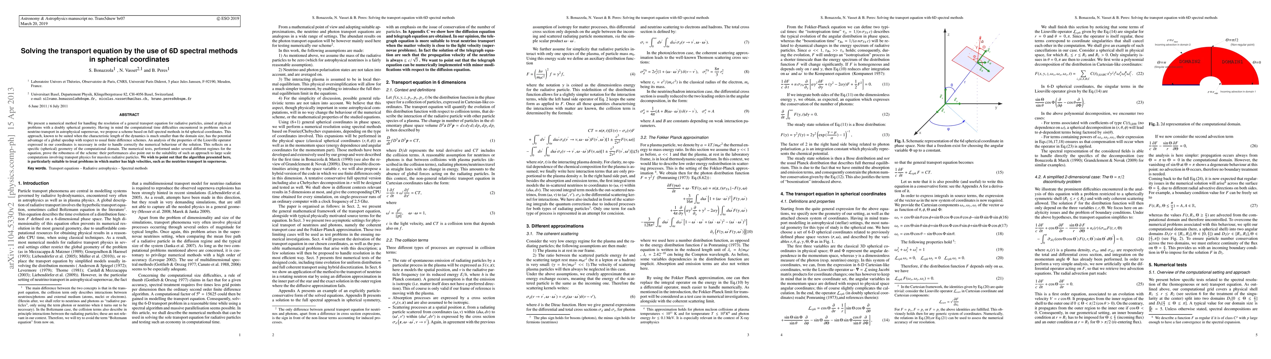 We present a numerical method for handling the resolution of a general transport equation for radiative particles, aimed at physical problems with a general spherical geometry. Having in mind the computational time difficulties encountered in problems such as neutrino transport in astrophysical supernovae, we present a scheme based on full spectral methods in 6d spherical coordinates. This approach, known to be suited when the characteristic length of the dynamics is much smaller than the domain size, has the potential advantage of a global speedup with respect to usual finite difference schemes. An analysis of the properties of the Liouville operator expressed in our coordinates is necessary in order to handle correctly the numerical behaviour of the solution. This reflects on a specific (spherical) geometry of the computational domain. The numerical tests, performed under several different regimes for the equation, prove the robustness of the scheme: their performances also point out to the suitability of such an approach to large scale computations involving transport physics for mass less radiative particles.