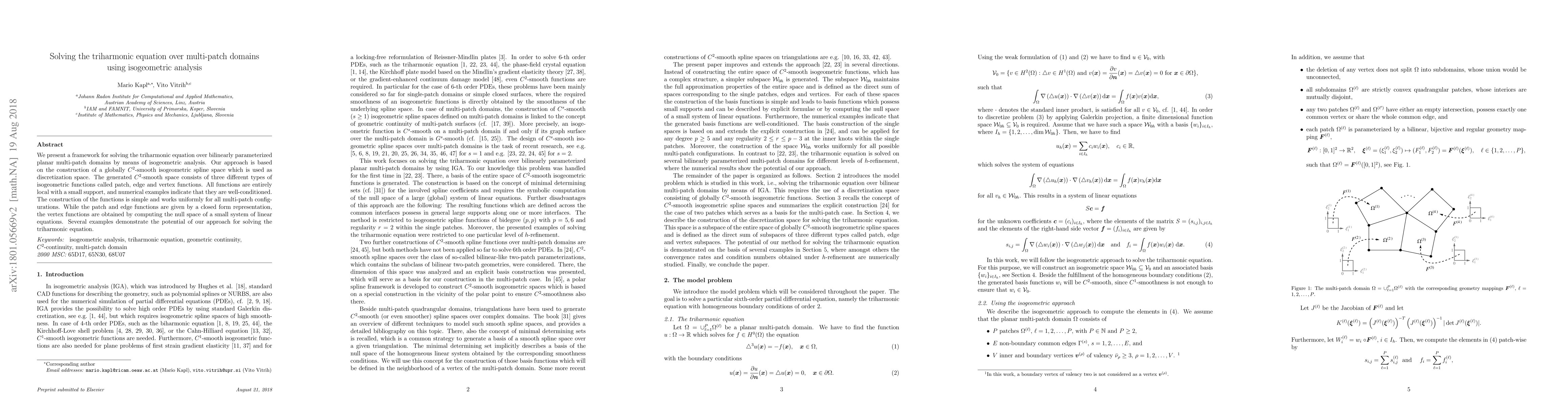 We present a framework for solving the triharmonic equation over bilinearly parameterized planar multi-patch domains by means of isogeometric analysis. Our approach is based on the construction of a globally $C^2$-smooth isogeometric spline space which is used as discretization space. The generated $C^2$-smooth space consists of three different types of isogeometric functions called patch, edge and vertex functions. All functions are entirely local with a small support, and numerical examples indicate that they are well-conditioned. The construction of the functions is simple and works uniformly for all multi-patch configurations. While the patch and edge functions are given by a closed form representation, the vertex functions are obtained by computing the null space of a small system of linear equations. Several examples demonstrate the potential of our approach for solving the triharmonic equation.