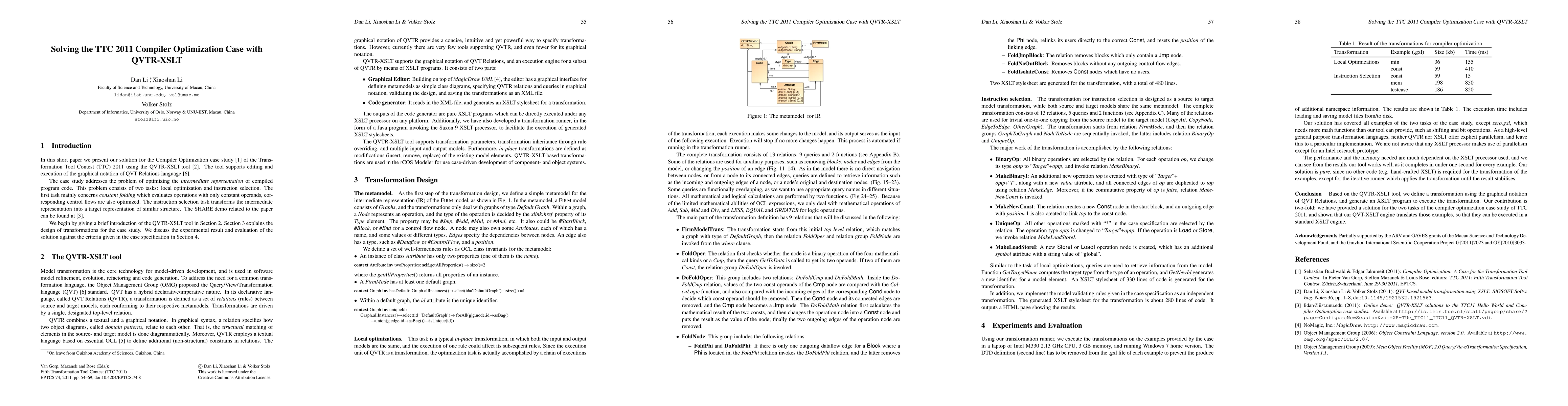 Summary: This paper details a solution for the 2011 Transformation Tool Contest's Compiler Optimization case using the QVTR-XSLT tool, which facilitates editing and execution of QVT Relations language graphical notations. The approach demonstrates effective optimization strategies.