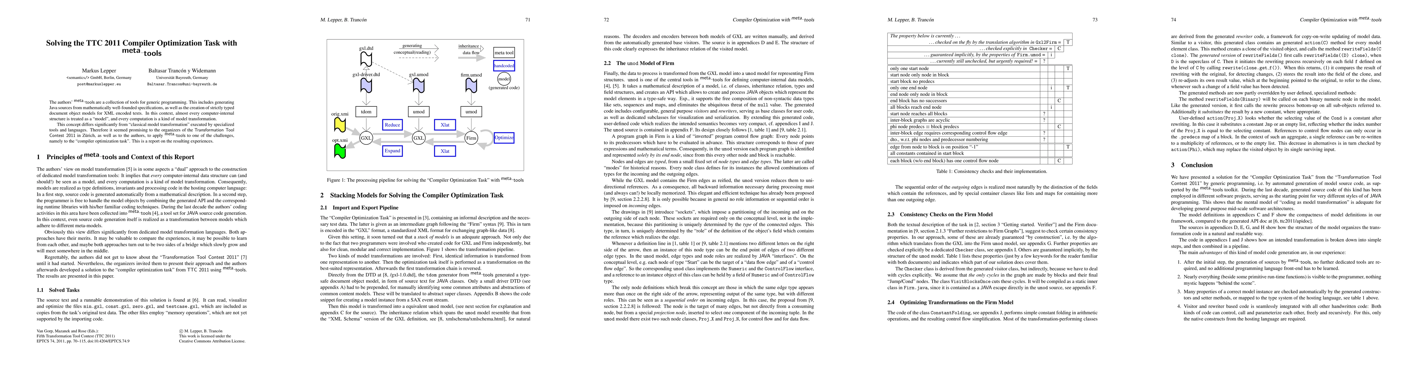 The authors' "metatools" are a collection of tools for generic programming. This includes generating Java sources from mathematically well-founded specifications, as well as the creation of strictly typed document object models for XML encoded texts. In this context, almost every computer-internal structure is treated as a "model", and every computation is a kind of model transformation. This concept differs significantly from "classical model transformation" executed by specialized tools and languages. Therefore it seemed promising to the organizers of the TTC 2011, as well as to the authors, to apply metatools to one of the challenges, namely to the "compiler optimization task". This is a report on the resulting experiences.