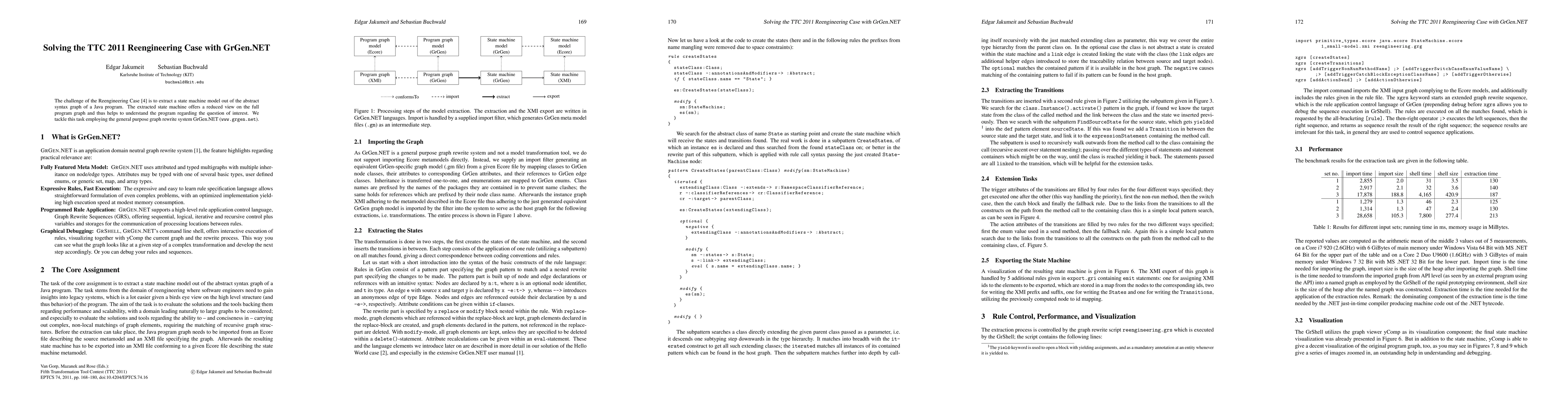 The challenge of the Reengineering Case is to extract a state machine model out of the abstract syntax graph of a Java program. The extracted state machine offers a reduced view on the full program graph and thus helps to understand the program regarding the question of interest. We tackle this task employing the general purpose graph rewrite system GrGen.NET (www.grgen.net).