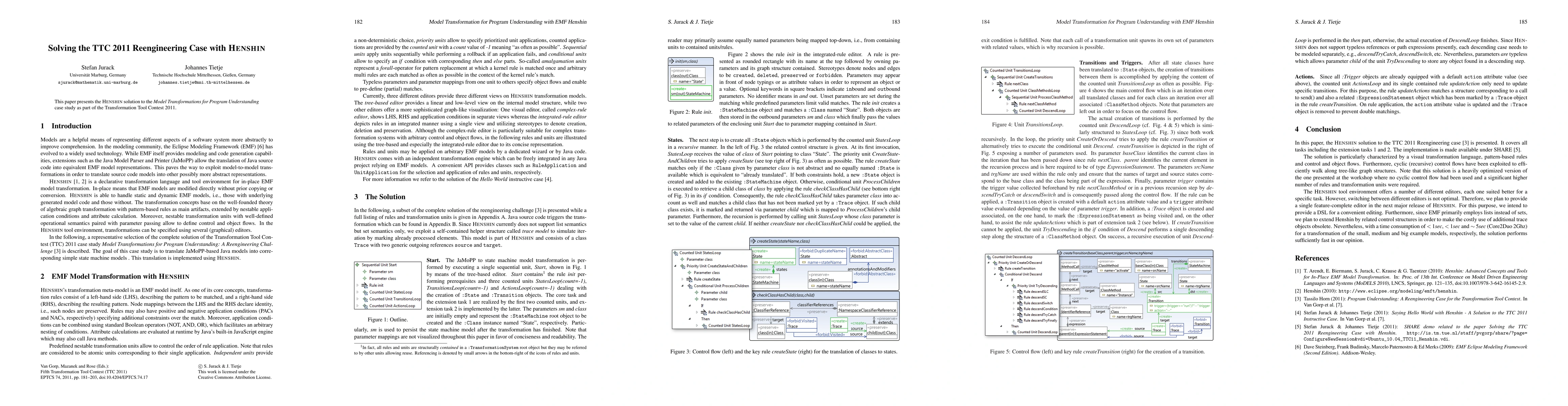 This paper details the application of Henshin, an advanced model transformation tool, to the TTC 2011 Model Transformations for Program Understanding case study, showcasing its effectiveness and potential in such scenarios.