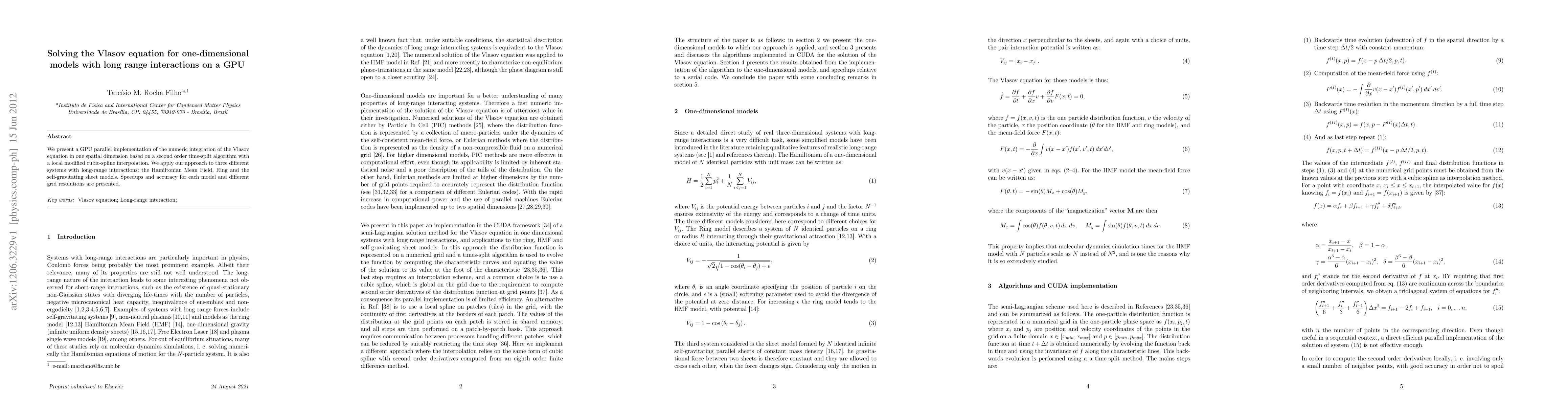 This paper details a GPU-based parallel implementation for solving the Vlasov equation in one dimension, employing a second-order time-split method with cubic-spline interpolation. The approach is tested on three long-range interaction models, demonstrating significant speedups and maintaining accuracy across various grid resolutions.