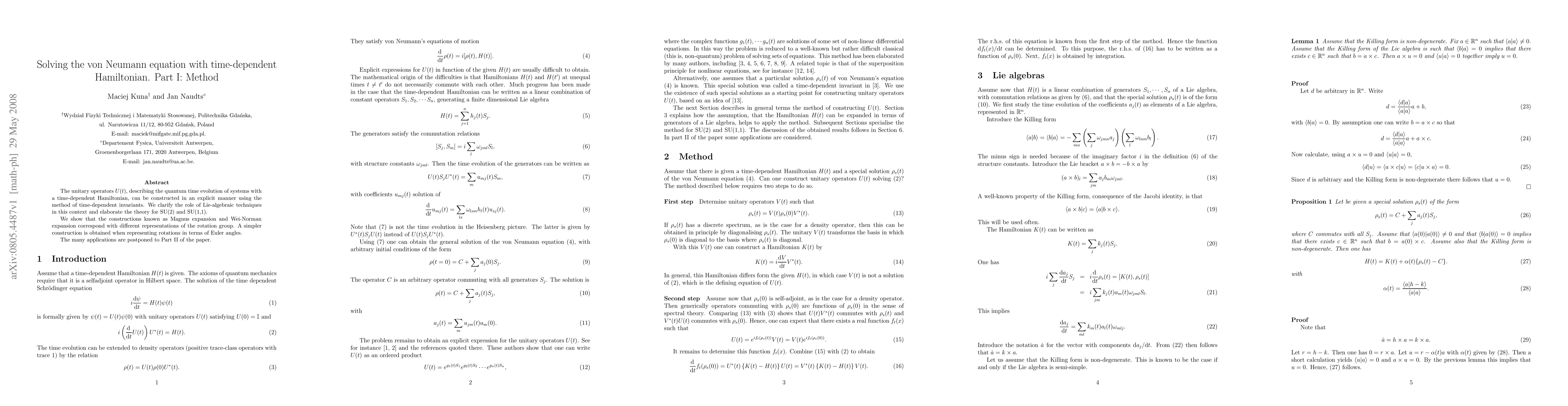 The unitary operators U(t), describing the quantum time evolution of systems with a time-dependent Hamiltonian, can be constructed in an explicit manner using the method of time-dependent invariants. We clarify the role of Lie-algebraic techniques in this context and elaborate the theory for SU(2) and SU(1,1). We show that the constructions known as Magnus expansion and Wei-Norman expansion correspond with different representations of the rotation group. A simpler construction is obtained when representing rotations in terms of Euler angles. The many applications are postponed to Part II of the paper.
