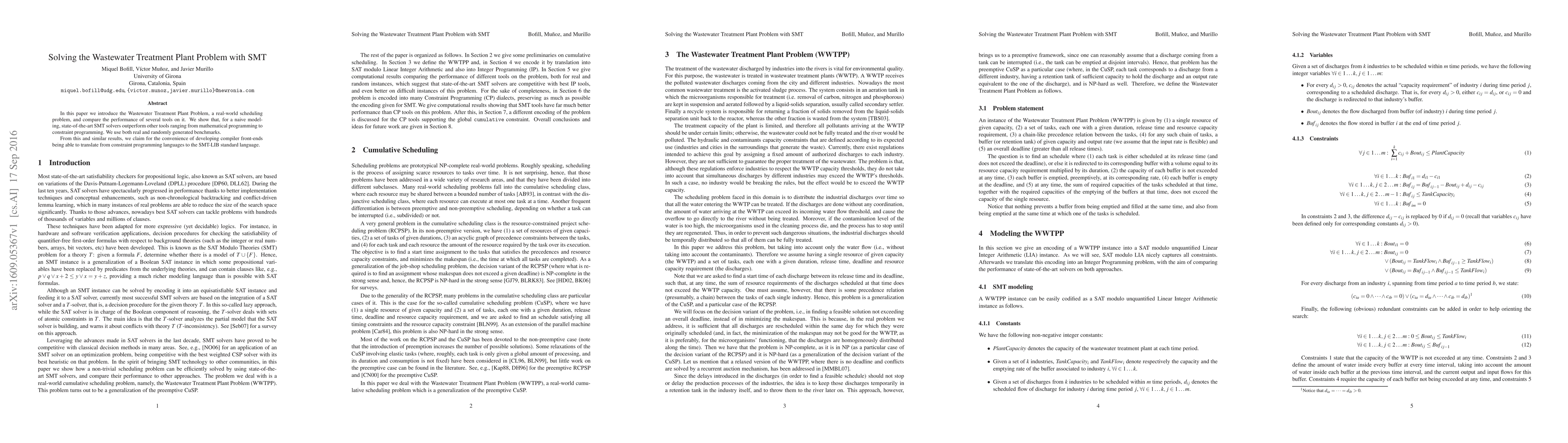 In this paper we introduce the Wastewater Treatment Plant Problem, a real-world scheduling problem, and compare the performance of several tools on it. We show that, for a naive modeling, state-of-the-art SMT solvers outperform other tools ranging from mathematical programming to constraint programming. We use both real and randomly generated benchmarks. From this and similar results, we claim for the convenience of developing compiler front-ends being able to translate from constraint programming languages to the SMT-LIB standard language.
