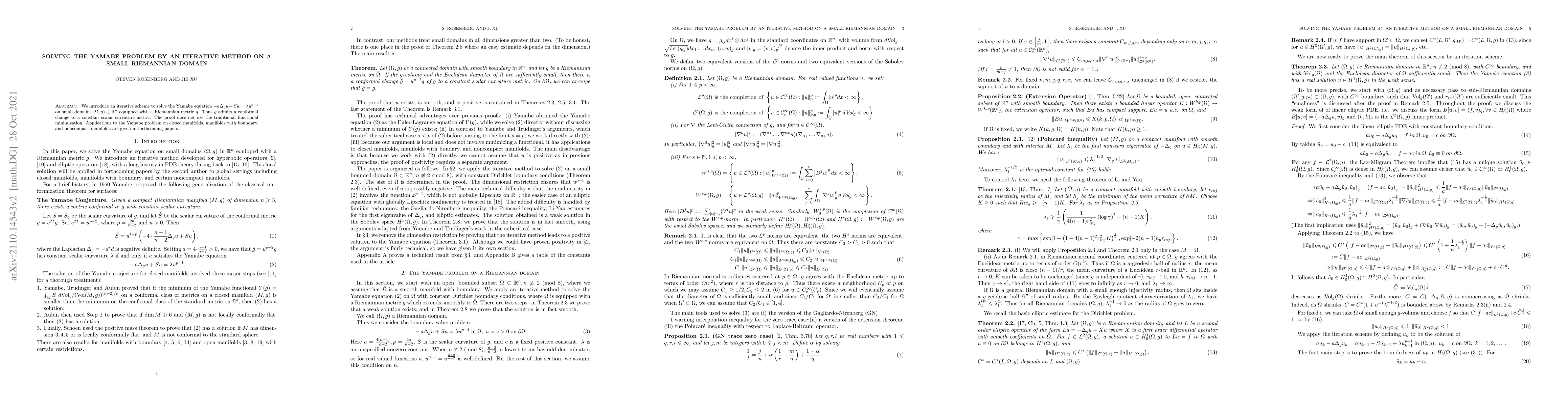This paper proposes an iterative method to solve the Yamabe equation on small Riemannian domains without traditional functional minimization, aiming to achieve a conformal change to a constant scalar curvature metric. Future work will extend these results to closed, boundary, and noncompact manifolds.