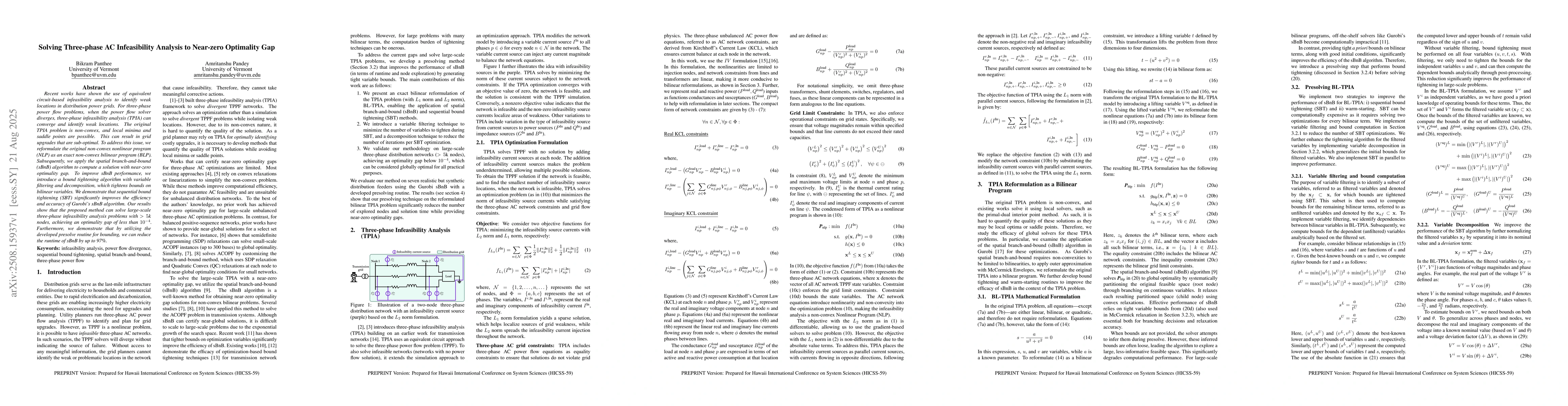 Recent works have shown the use of equivalent circuit-based infeasibility analysis to identify weak locations in distribution power grids. For three-phase power flow problems, when the power flow solver diverges, three-phase infeasibility analysis (TPIA) can converge and identify weak locations. The original TPIA problem is non-convex, and local minima and saddle points are possible. This can result in grid upgrades that are sub-optimal. To address this issue, we reformulate the original non-convex nonlinear program (NLP) as an exact non-convex bilinear program (BLP). Subsequently, we apply the spatial branch-and-bound (SBnB) algorithm to compute a solution with near-zero optimality gap. To improve SBnB performance, we introduce a bound tightening algorithm with variable filtering and decomposition, which tightens bounds on bilinear variables. We demonstrate that sequential bound tightening (SBT) significantly improves the efficiency and accuracy of Gurobi's SBnB algorithm. Our results show that the proposed method can solve large-scale three-phase infeasibility analysis problems with >5k nodes, achieving an optimality gap of less than 10e-4. Furthermore, we demonstrate that by utilizing the developed presolve routine for bounding, we can reduce the runtime of SBnB by up to 97%.