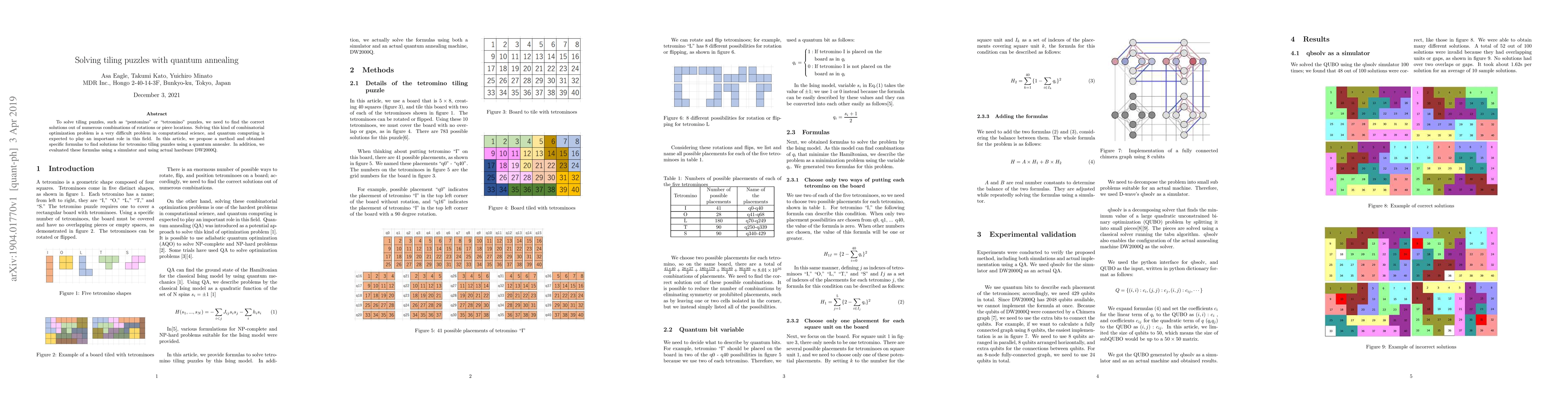 This paper proposes a method for solving tiling puzzles like tetromino puzzles using quantum annealing, demonstrating specific formulas and evaluating them both on a simulator and actual DW2000Q quantum hardware. The study highlights the potential of quantum computing in tackling combinatorial optimization problems.