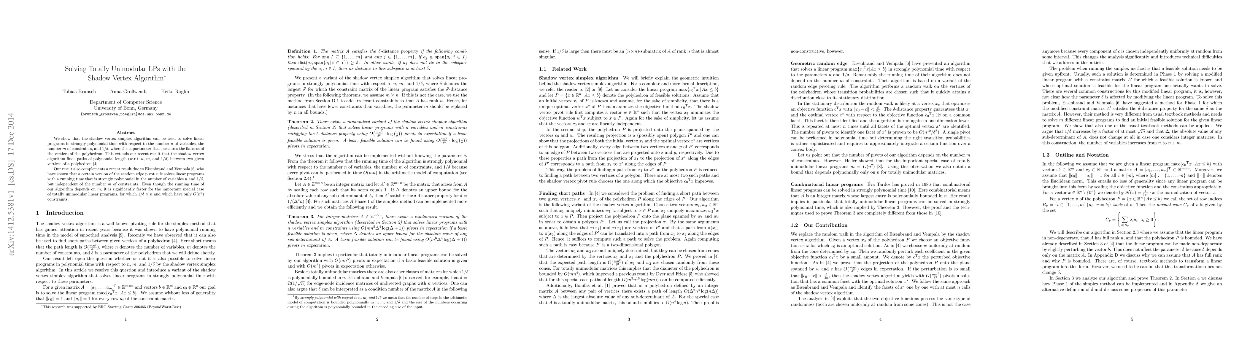We show that the shadow vertex simplex algorithm can be used to solve linear programs in strongly polynomial time with respect to the number $n$ of variables, the number $m$ of constraints, and $1/\delta$, where $\delta$ is a parameter that measures the flatness of the vertices of the polyhedron. This extends our recent result that the shadow vertex algorithm finds paths of polynomial length (w.r.t. $n$, $m$, and $1/\delta$) between two given vertices of a polyhedron. Our result also complements a recent result due to Eisenbrand and Vempala who have shown that a certain version of the random edge pivot rule solves linear programs with a running time that is strongly polynomial in the number of variables $n$ and $1/\delta$, but independent of the number $m$ of constraints. Even though the running time of our algorithm depends on $m$, it is significantly faster for the important special case of totally unimodular linear programs, for which $1/\delta\le n$ and which have only $O(n^2)$ constraints.
