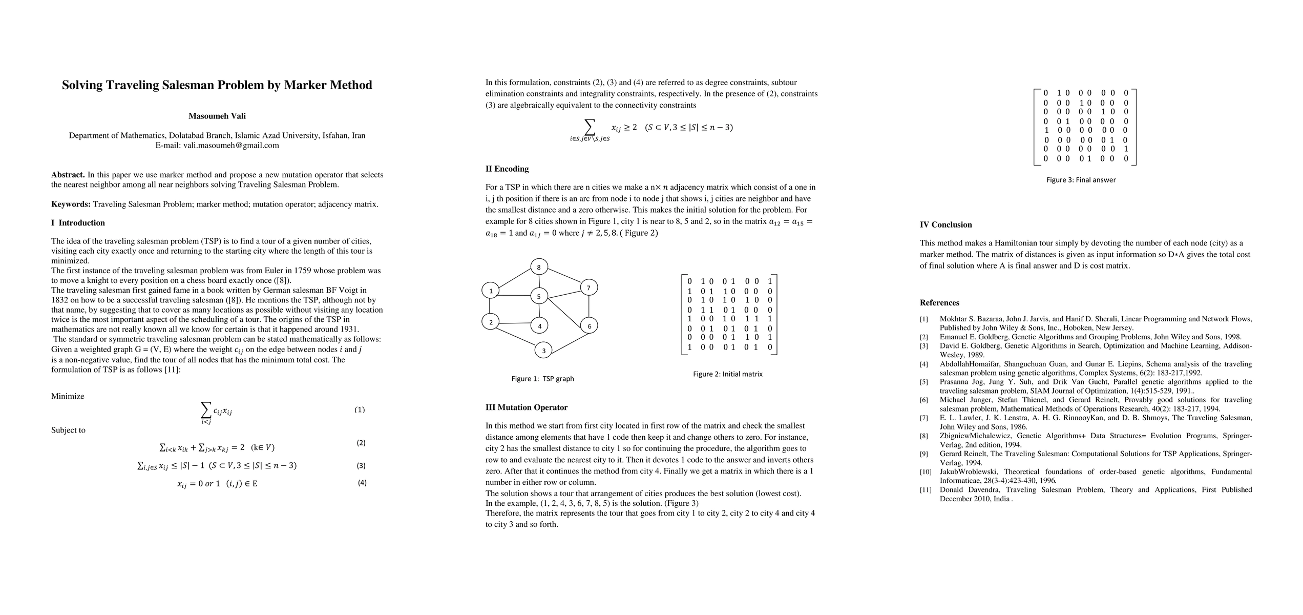 Summary: This paper introduces a marker method for solving the Traveling Salesman Problem (TSP) and proposes a novel mutation operator that selects the nearest neighbor among all nearby options to optimize the route.