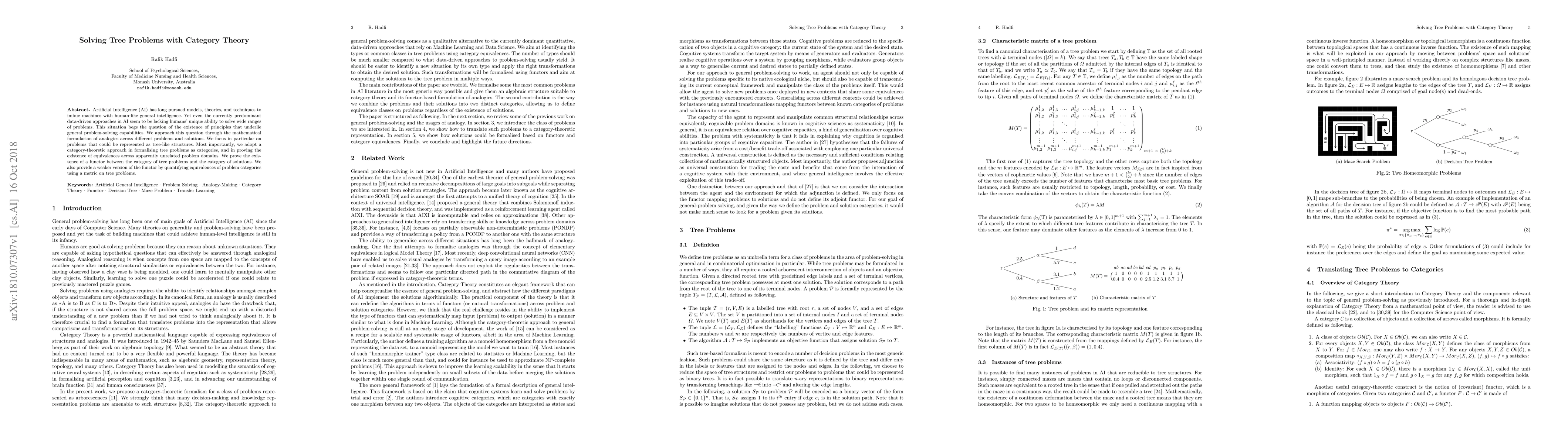 Artificial Intelligence (AI) has long pursued models, theories, and techniques to imbue machines with human-like general intelligence. Yet even the currently predominant data-driven approaches in AI seem to be lacking humans' unique ability to solve wide ranges of problems. This situation begs the question of the existence of principles that underlie general problem-solving capabilities. We approach this question through the mathematical formulation of analogies across different problems and solutions. We focus in particular on problems that could be represented as tree-like structures. Most importantly, we adopt a category-theoretic approach in formalising tree problems as categories, and in proving the existence of equivalences across apparently unrelated problem domains. We prove the existence of a functor between the category of tree problems and the category of solutions. We also provide a weaker version of the functor by quantifying equivalences of problem categories using a metric on tree problems.