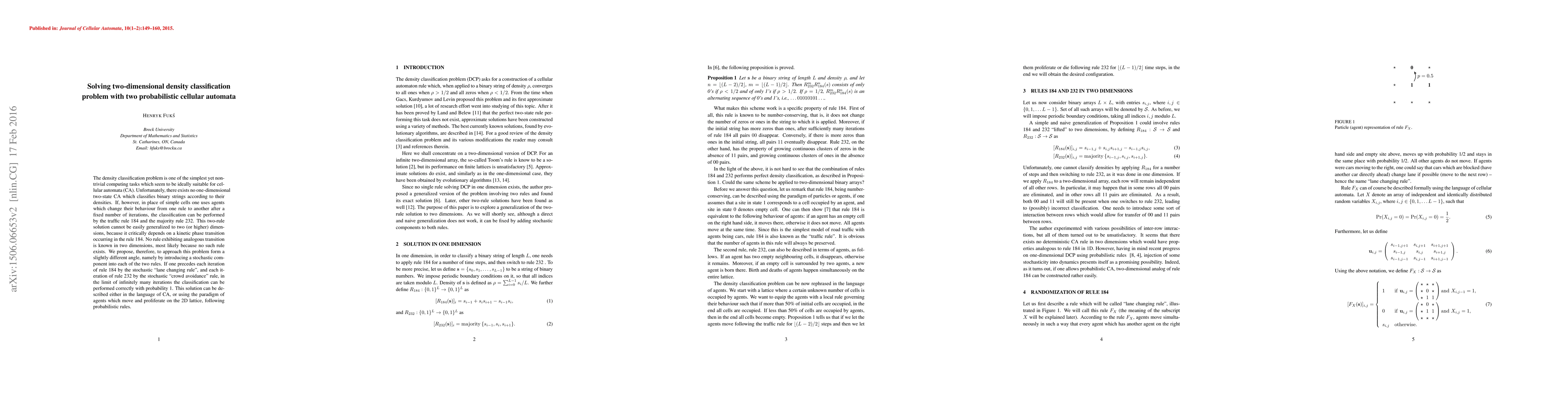 The research proposes a probabilistic two-rule scheme for two-dimensional density classification using cellular automata, involving rules FXR184 and GXR232, with stochastic elements to handle limitations of one-dimensional solutions.