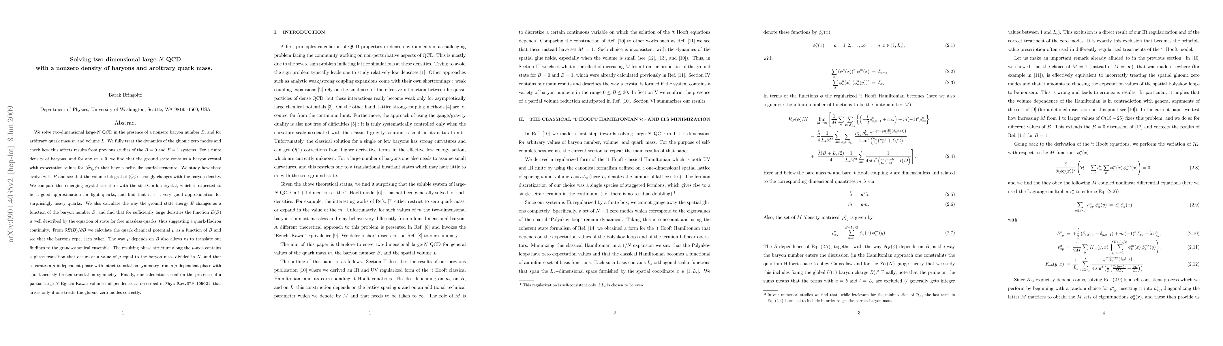 We solve two-dimensional large-N QCD in the presence of a nonzero baryon number B, and for arbitrary quark mass m and volume L. We fully treat the dynamics of the gluonic zero modes and check how this affects results from previous studies of the B=0 and B=1 systems. For a finite density of baryons, and for any m>0, we find that the ground state contains a baryon crystal with expectation values for psi-bar gamma_mu psi that have a helix-like spatial structure. We study how these evolve with B and see that the volume integral of psi-bar psi strongly changes with the baryon density. We compare this emerging crystal structure with the sine-Gordon crystal, which is expected to be a good approximation for light quarks, and find that it is a very good approximation for surprisingly heavy quarks. We also calculate the way the ground state energy E changes as a function of the baryon number B, and find that for sufficiently large densities the function E(B) is well described by the equation of state for free massless quarks, thus suggesting a quark-Hadron continuity. From dE(B)/dB we calculate the quark chemical potential mu as a function of B and see that the baryons repel each other. The way mu depends on B also allows us to translate our findings to the grand-canonical ensemble. The resulting phase structure along the mu-axis contains a phase transition that occurs at a value of mu equal to the baryon mass divided in N, and that separates a mu-independent phase with intact translation symmetry from a mu-dependent phase with spontaneously broken translation symmetry. Finally, our calculations confirm the presence of a partial large-N Eguchi-Kawai volume independence, as described in Phys.Rev.D79:105021, that arises only if one treats the gluonic zero modes correctly.