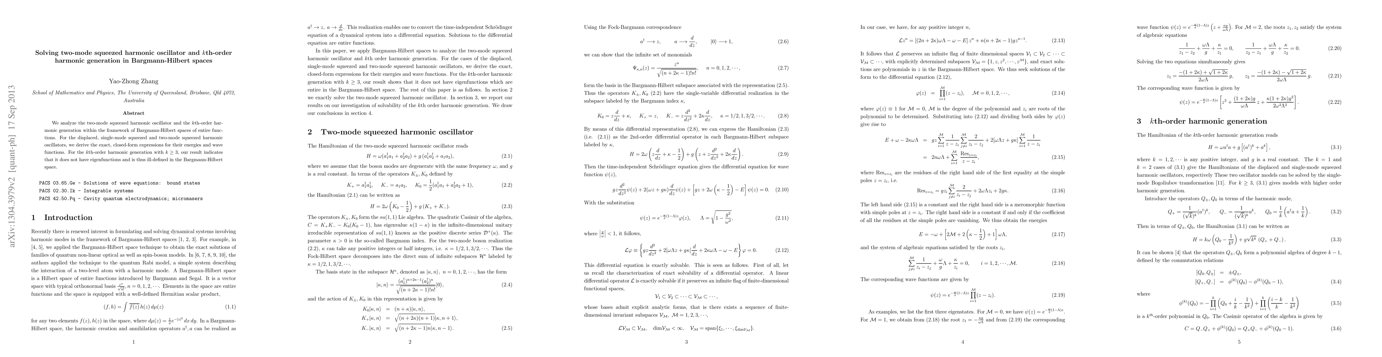 Researchers solved two-mode squeezed harmonic oscillator and kth-order harmonic generation in Bargmann-Hilbert spaces, finding closed-form expressions for energies and wave functions but indicating the kth-order generation is ill-defined for k >= 3.