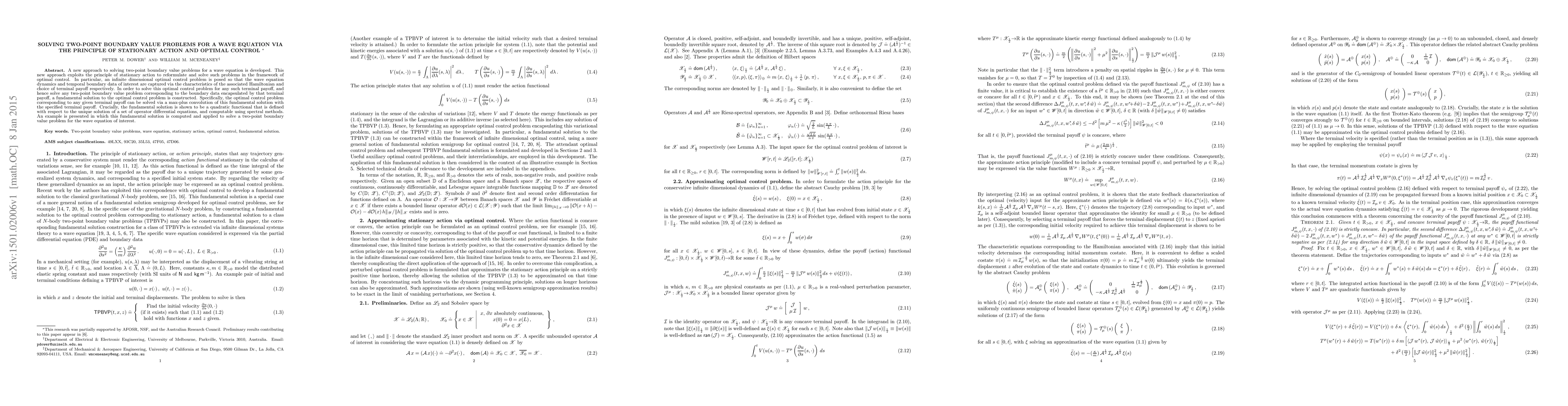 A new approach to solving two-point boundary value problems for a wave equation is developed. This new approach exploits the principle of stationary action to reformulate and solve such problems in the framework of optimal control. In particular, an infinite dimensional optimal control problem is posed so that the wave equation dynamics and temporal boundary data of interest are captured via the characteristics of the associated Hamiltonian and choice of terminal payoff respectively. In order to solve this optimal control problem for any such terminal payoff, and hence solve any two-point boundary value problem corresponding to the boundary data encapsulated by that terminal payoff, a fundamental solution to the optimal control problem is constructed. Specifically, the optimal control problem corresponding to any given terminal payoff can be solved via a max-plus convolution of this fundamental solution with the specified terminal payoff. Crucially, the fundamental solution is shown to be a quadratic functional that is defined with respect to the unique solution of a set of operator differential equations, and computable using spectral methods. An example is presented in which this fundamental solution is computed and applied to solve a two-point boundary value problem for the wave equation of interest.