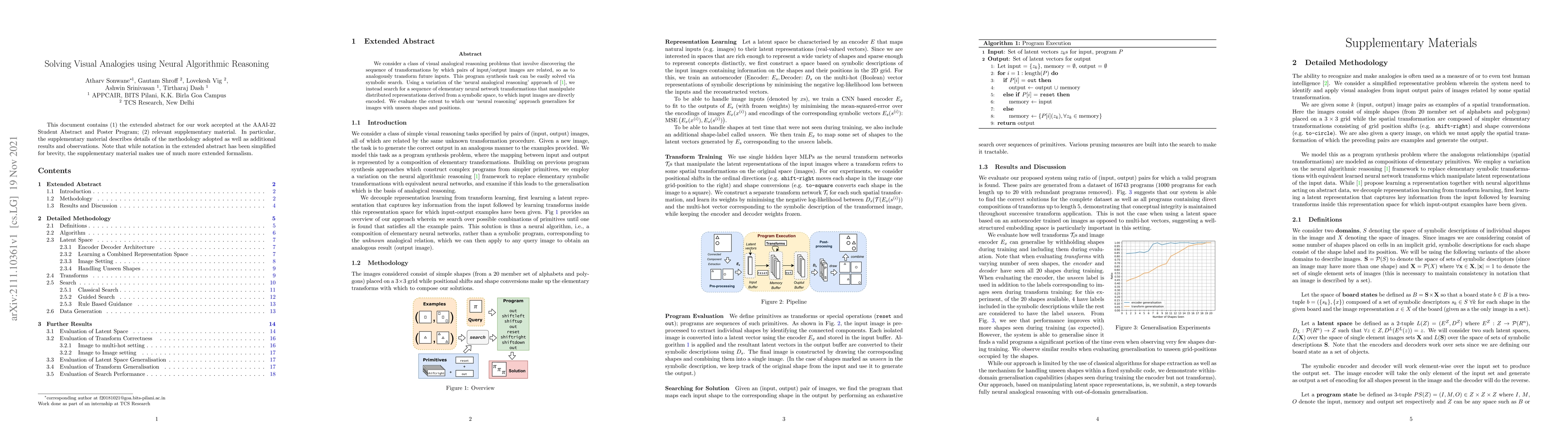 This paper explores a neural algorithmic reasoning approach to solve visual analogy problems by discovering transformation sequences between input and output images. It evaluates the generalization of this method for images with novel shapes and positions.