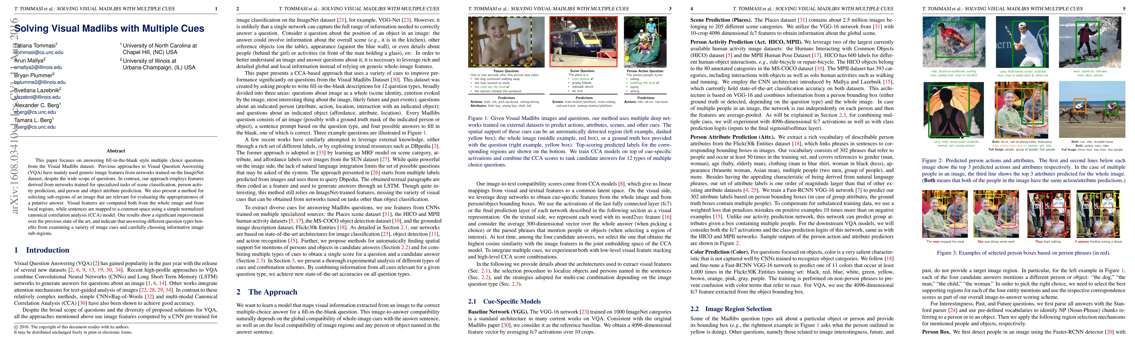 This paper focuses on answering fill-in-the-blank style multiple choice questions from the Visual Madlibs dataset. Previous approaches to Visual Question Answering (VQA) have mainly used generic image features from networks trained on the ImageNet dataset, despite the wide scope of questions. In contrast, our approach employs features derived from networks trained for specialized tasks of scene classification, person activity prediction, and person and object attribute prediction. We also present a method for selecting sub-regions of an image that are relevant for evaluating the appropriateness of a putative answer. Visual features are computed both from the whole image and from local regions, while sentences are mapped to a common space using a simple normalized canonical correlation analysis (CCA) model. Our results show a significant improvement over the previous state of the art, and indicate that answering different question types benefits from examining a variety of image cues and carefully choosing informative image sub-regions.