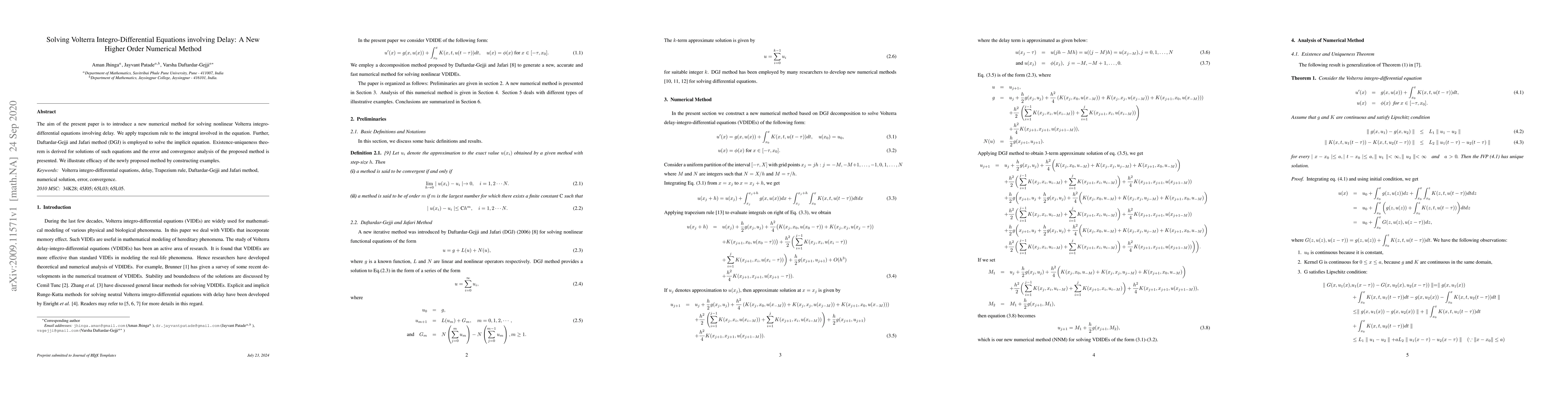 The aim of the present paper is to introduce a new numerical method for solving nonlinear Volterra integro-differential equations involving delay. We apply trapezium rule to the integral involved in the equation. Further, Daftardar-Gejji and Jafari method (DGJ) is employed to solve the implicit equation. Existence-uniqueness theorem is derived for solutions of such equations and the error and convergence analysis of the proposed method is presented. We illustrate efficacy of the newly proposed method by constructing examples.