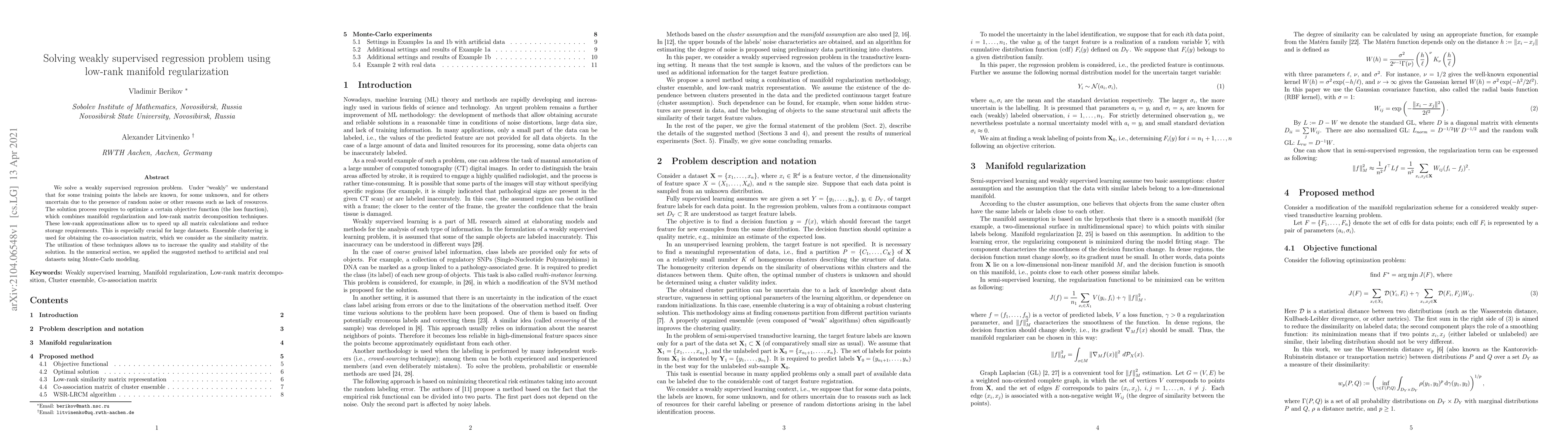 This paper addresses weakly supervised regression problems by combining manifold regularization and low-rank matrix decomposition techniques to optimize a loss function. The approach leverages ensemble clustering for a similarity matrix and demonstrates improved solution quality and stability on both artificial and real datasets.