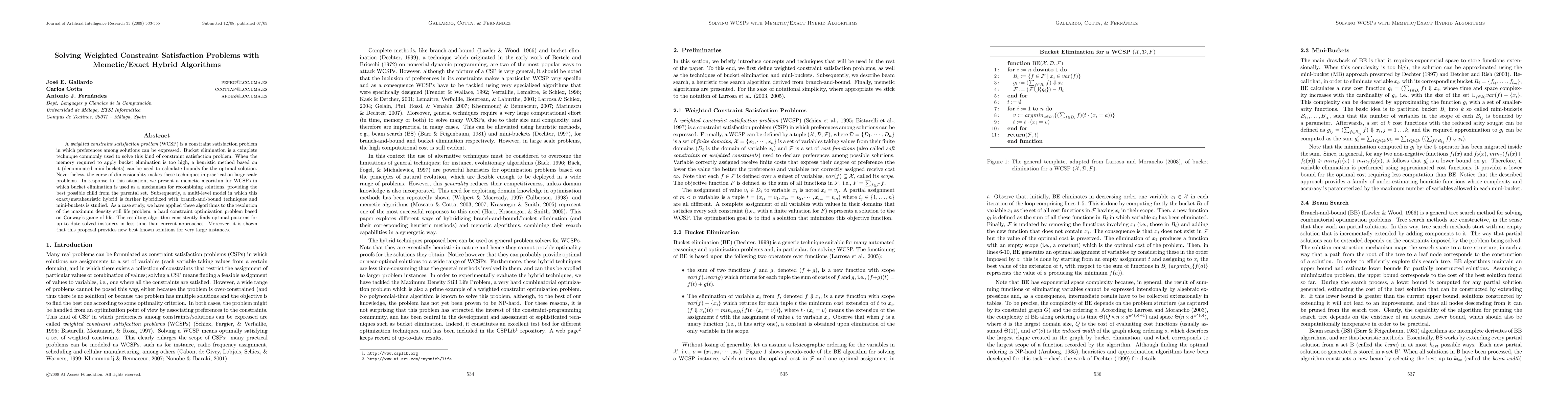 This paper proposes a memetic algorithm combining bucket elimination and exact methods to solve weighted constraint satisfaction problems (WCSPs), demonstrating improved efficiency and optimality for large-scale instances, particularly for the maximum density still life problem. The hybrid approach effectively addresses the curse of dimensionality and outperforms existing methods.