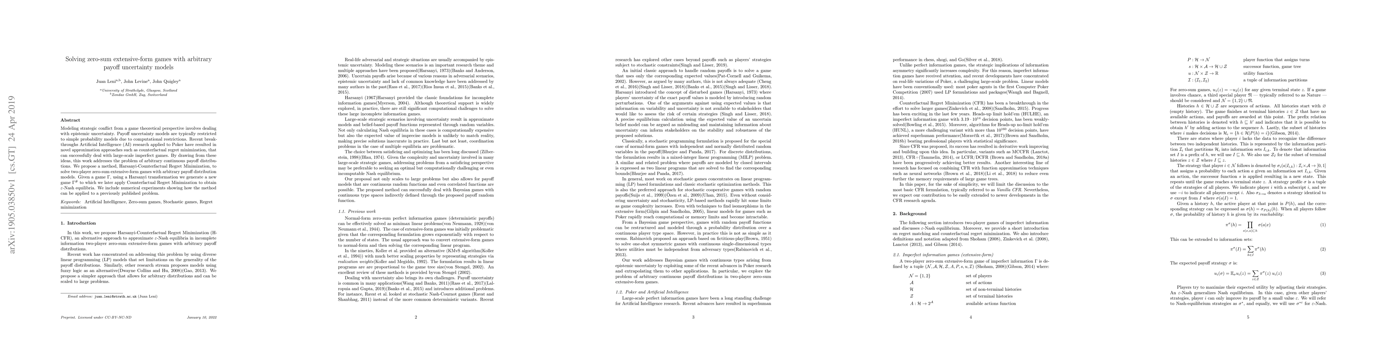 Modeling strategic conflict from a game theoretical perspective involves dealing with epistemic uncertainty. Payoff uncertainty models are typically restricted to simple probability models due to computational restrictions. Recent breakthroughs Artificial Intelligence (AI) research applied to Poker have resulted in novel approximation approaches such as counterfactual regret minimization, that can successfully deal with large-scale imperfect games. By drawing from these ideas, this work addresses the problem of arbitrary continuous payoff distributions. We propose a method, Harsanyi-Counterfactual Regret Minimization, to solve two-player zero-sum extensive-form games with arbitrary payoff distribution models. Given a game $\Gamma$, using a Harsanyi transformation we generate a new game $\Gamma^\#$ to which we later apply Counterfactual Regret Minimization to obtain $\varepsilon$-Nash equilibria. We include numerical experiments showing how the method can be applied to a previously published problem.