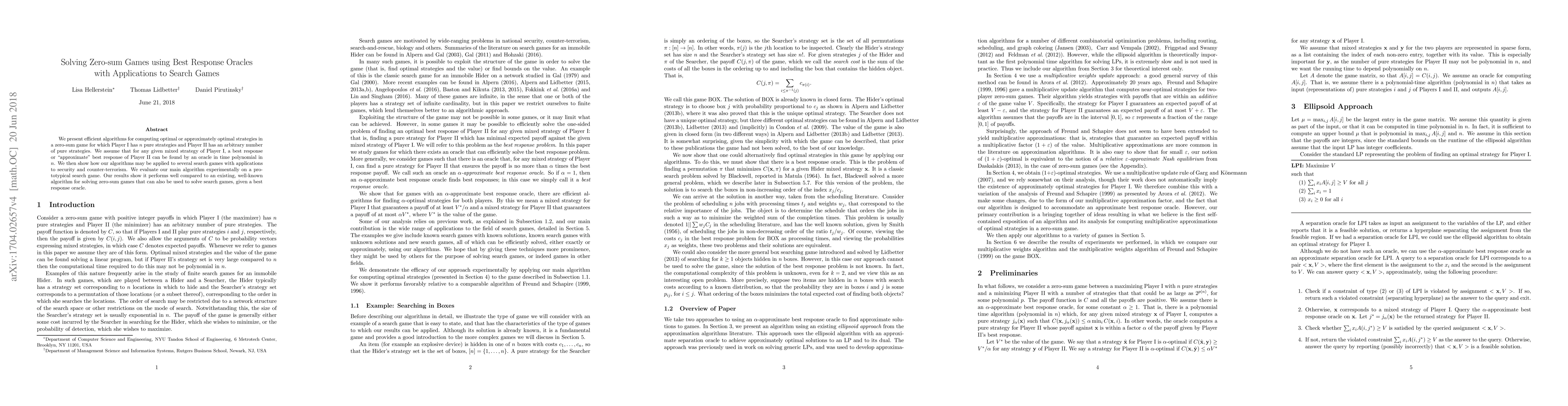This paper introduces efficient algorithms for finding optimal or near-optimal strategies in zero-sum games, leveraging best response oracles. The algorithms are applied to search games with implications for security and counter-terrorism, demonstrating competitive performance experimentally against existing methods.