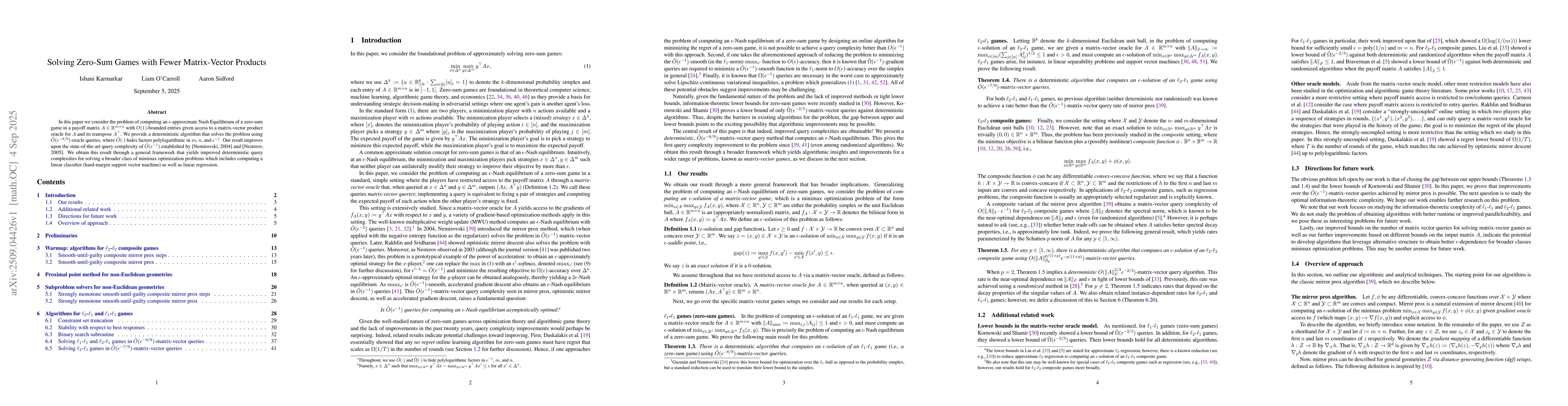In this paper we consider the problem of computing an $\epsilon$-approximate Nash Equilibrium of a zero-sum game in a payoff matrix $A \in \mathbb{R}^{m \times n}$ with $O(1)$-bounded entries given access to a matrix-vector product oracle for $A$ and its transpose $A^\top$. We provide a deterministic algorithm that solves the problem using $\tilde{O}(\epsilon^{-8/9})$-oracle queries, where $\tilde{O}(\cdot)$ hides factors polylogarithmic in $m$, $n$, and $\epsilon^{-1}$. Our result improves upon the state-of-the-art query complexity of $\tilde{O}(\epsilon^{-1})$ established by [Nemirovski, 2004] and [Nesterov, 2005]. We obtain this result through a general framework that yields improved deterministic query complexities for solving a broader class of minimax optimization problems which includes computing a linear classifier (hard-margin support vector machine) as well as linear regression.