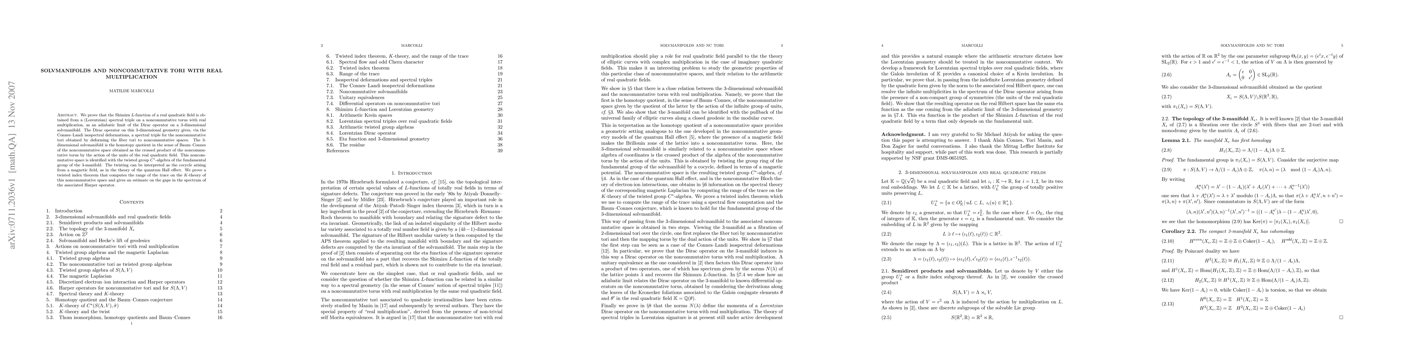 We prove that the Shimizu L-function of a real quadratic field is obtained from a (Lorentzian) spectral triple on a noncommutative torus with real multiplication, as an adiabatic limit of the Dirac operator on a 3-dimensional solvmanifold. The Dirac operator on this 3-dimensional geometry gives, via the Connes-Landi isospectral deformations, a spectral triple for the noncommutative tori obtained by deforming the fiber tori to noncommutative spaces. The 3-dimensional solvmanifold is the homotopy quotient in the sense of Baum--Connes of the noncommutative space obtained as the crossed product of the noncommutative torus by the action of the units of the real quadratic field. This noncommutative space is identified with the twisted group C*-algebra of the fundamental group of the 3-manifold. The twisting can be interpreted as the cocycle arising from a magnetic field, as in the theory of the quantum Hall effect. We prove a twisted index theorem that computes the range of the trace on the K-theory of this noncommutative space and gives an estimate on the gaps in the spectrum of the associated Harper operator.
