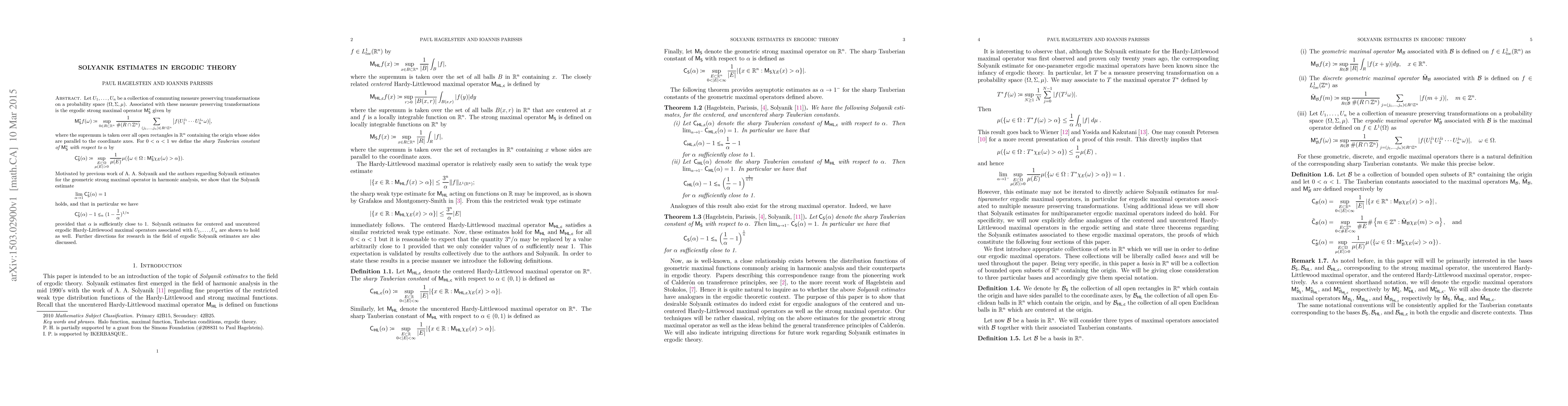 This paper proves Solyanik estimates for ergodic strong maximal operators in measure preserving transformations, showing that the sharp Tauberian constant approaches 1 as alpha nears 1. It also establishes similar estimates for centered and uncentered ergodic Hardy-Littlewood maximal operators, discussing further research directions in the field.